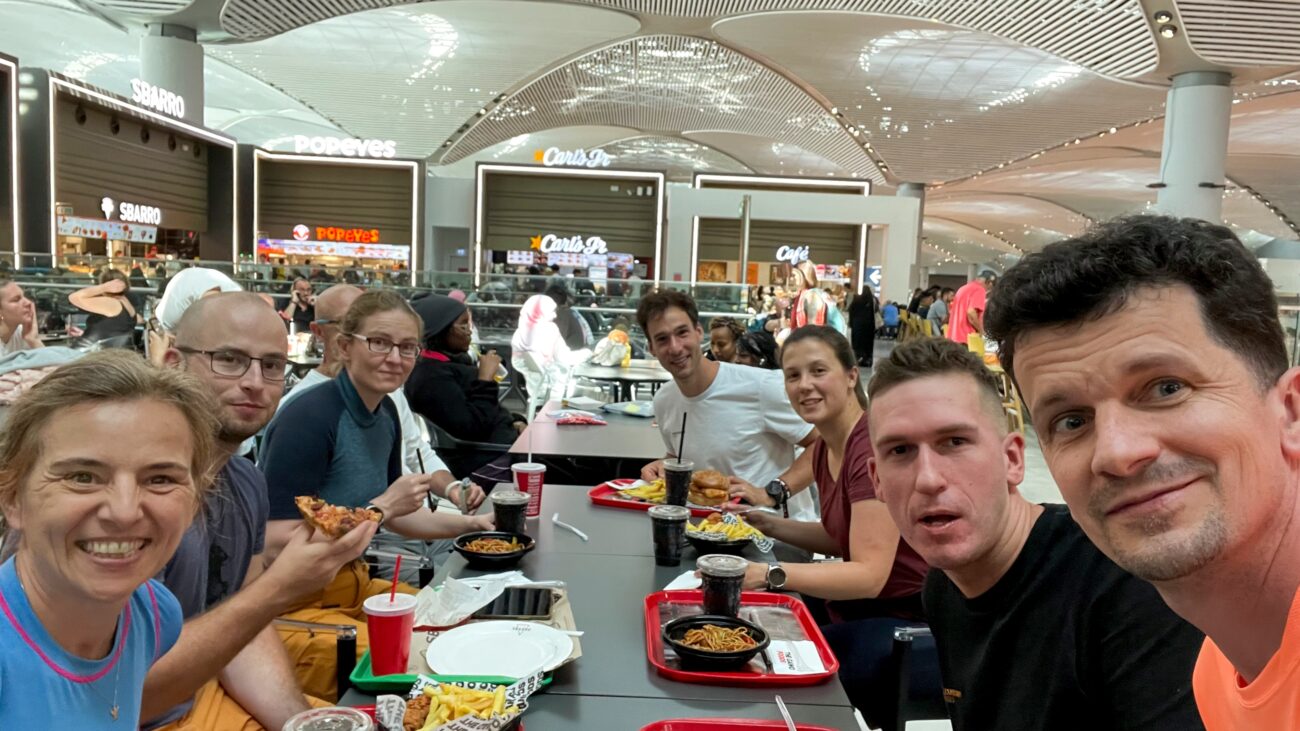 V Istanbulu máme skoro 6 hodin času. Jirka zjistil, že turecké aerolinky na tak dlouhý přestup dávají voucher na jídlo. No luxus, tomu říká zákaznický servis. Vyzvedneme si je na terminálu D a máme na cca 2 hodiny rozchod. Ten nakonec využívá jen Karel a zbytek bandy si posedá na zem a kecáme. V týmu máme 2 doktorky a jednoho doktora = bude o nás velmi dobře postaráno. Hlavním tématem na úvod je samozřejmě cestování a Lukáš se může pasovat do role ambasadora Expedition clubu – je to jeho šestá výprava s Expedition clubem!