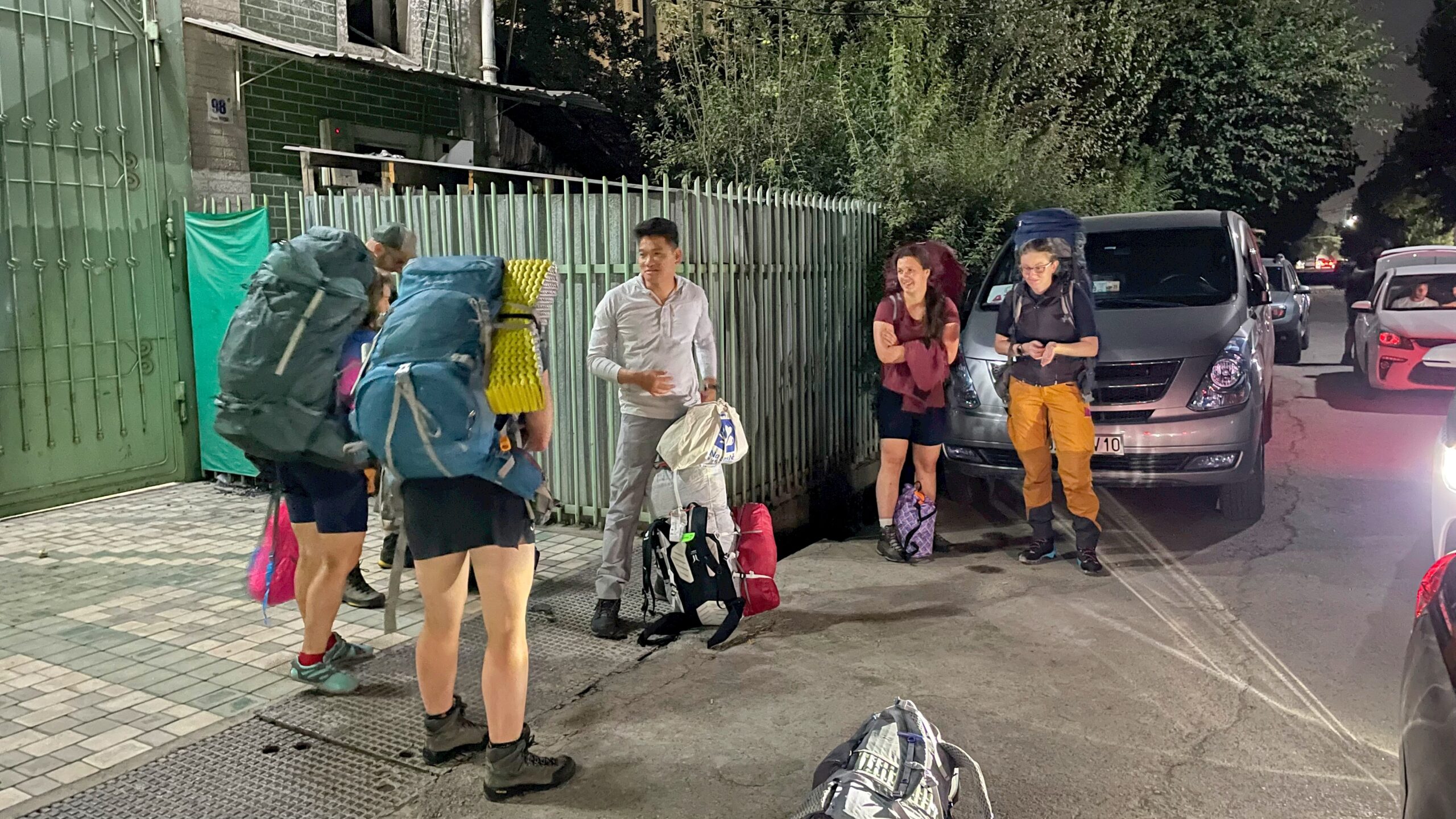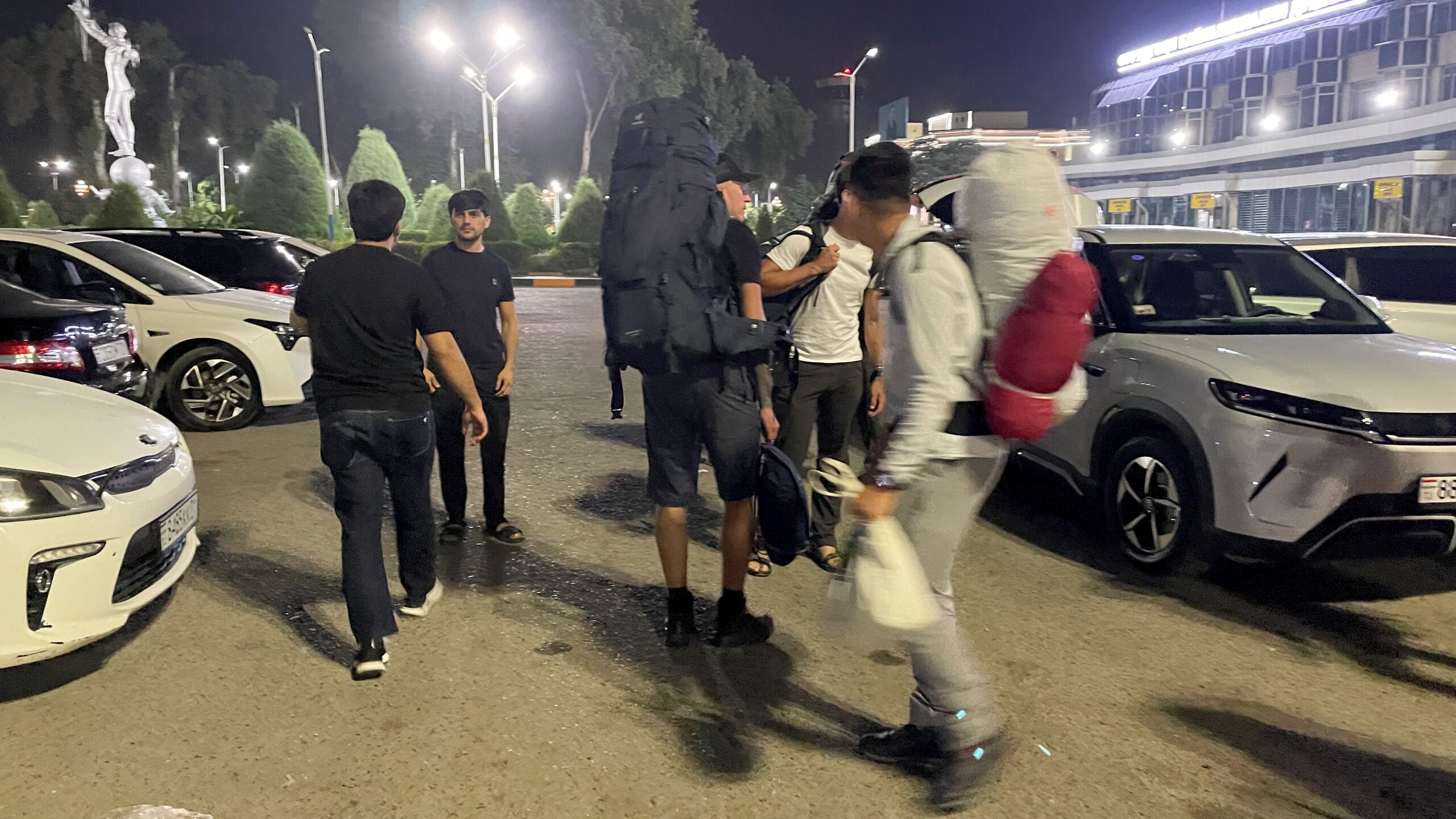 Tiep a Blanka tedy zpětně dopisují ten kus papíru, aby měli vše v cajku. Během toho všichni zdárně nacházíme batohy, což je moc fajn, protože řešit chybějící bágl na začátku výpravy by bylo trochu nemilé. Pak už se naše banda vydává vstříc Tádžikistánu a hned u výstupu se na nás slítnou naháněči. Nabídka je 10 dolarů na auto a my potřebujeme 3 auta. Áďa zkušeně navrhne, že 10 dolarů ano, ale za všechny tři auta. 😂 Nakonec to bereme a borci si nás rozdělí do aut (já jedu s Blankou, Tiepem a Áďou) a proplouváme nočním Dushanbe. Sedím vpředu, zapnutí pásu nefunguje a borec do toho ještě má video hovor. Bezpečnost jak víno aka opět vítejte v Asii. 😉