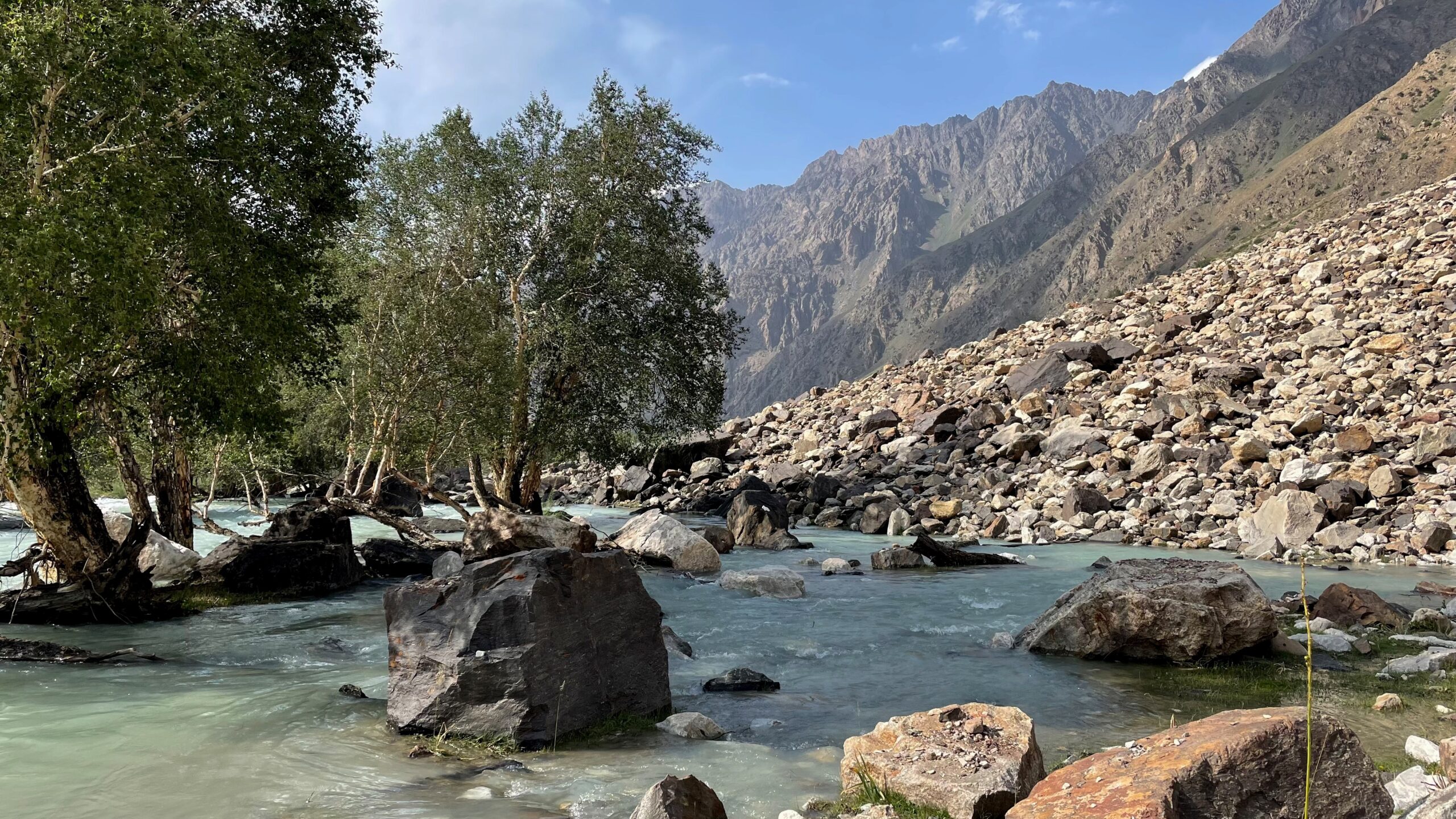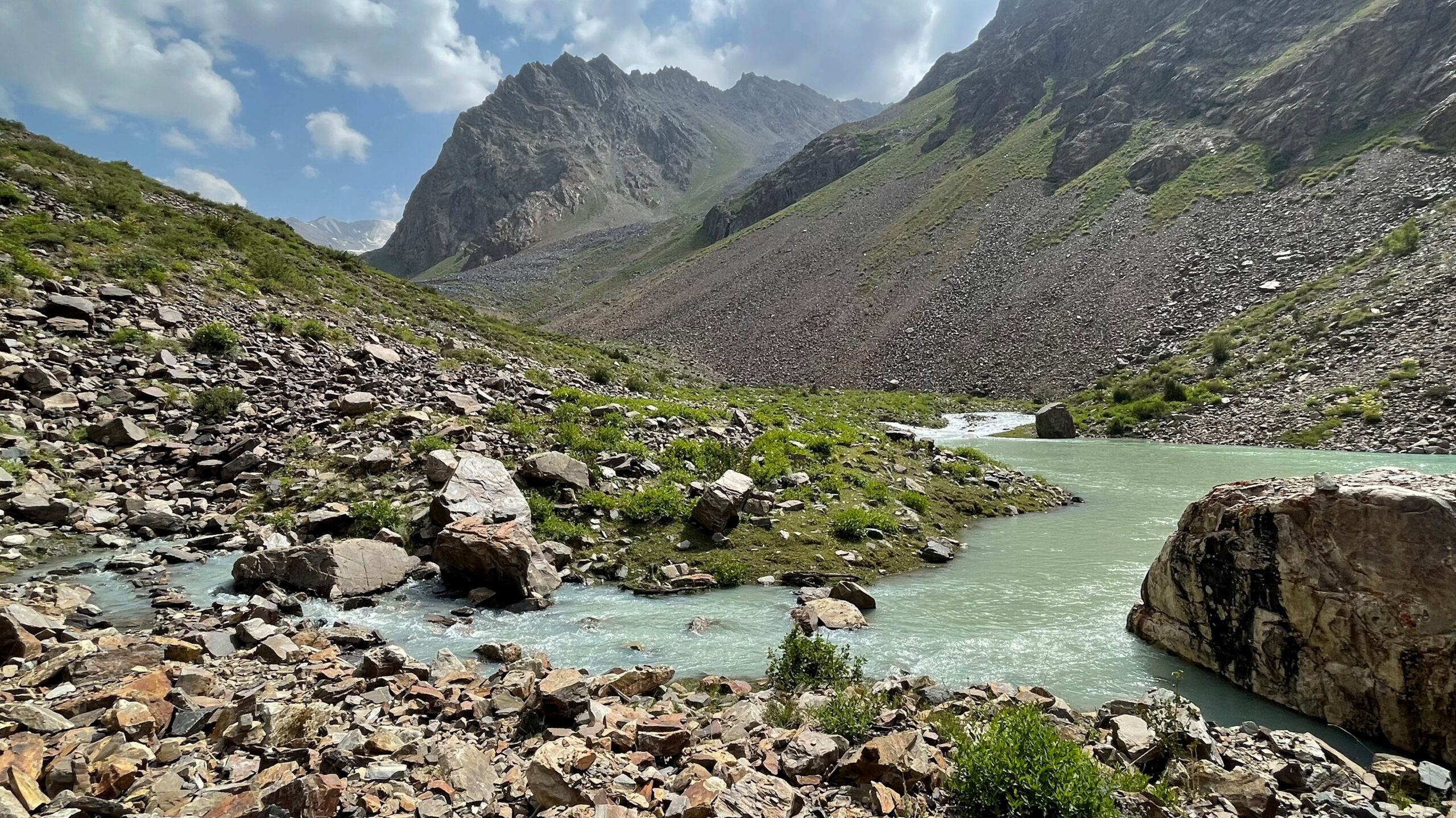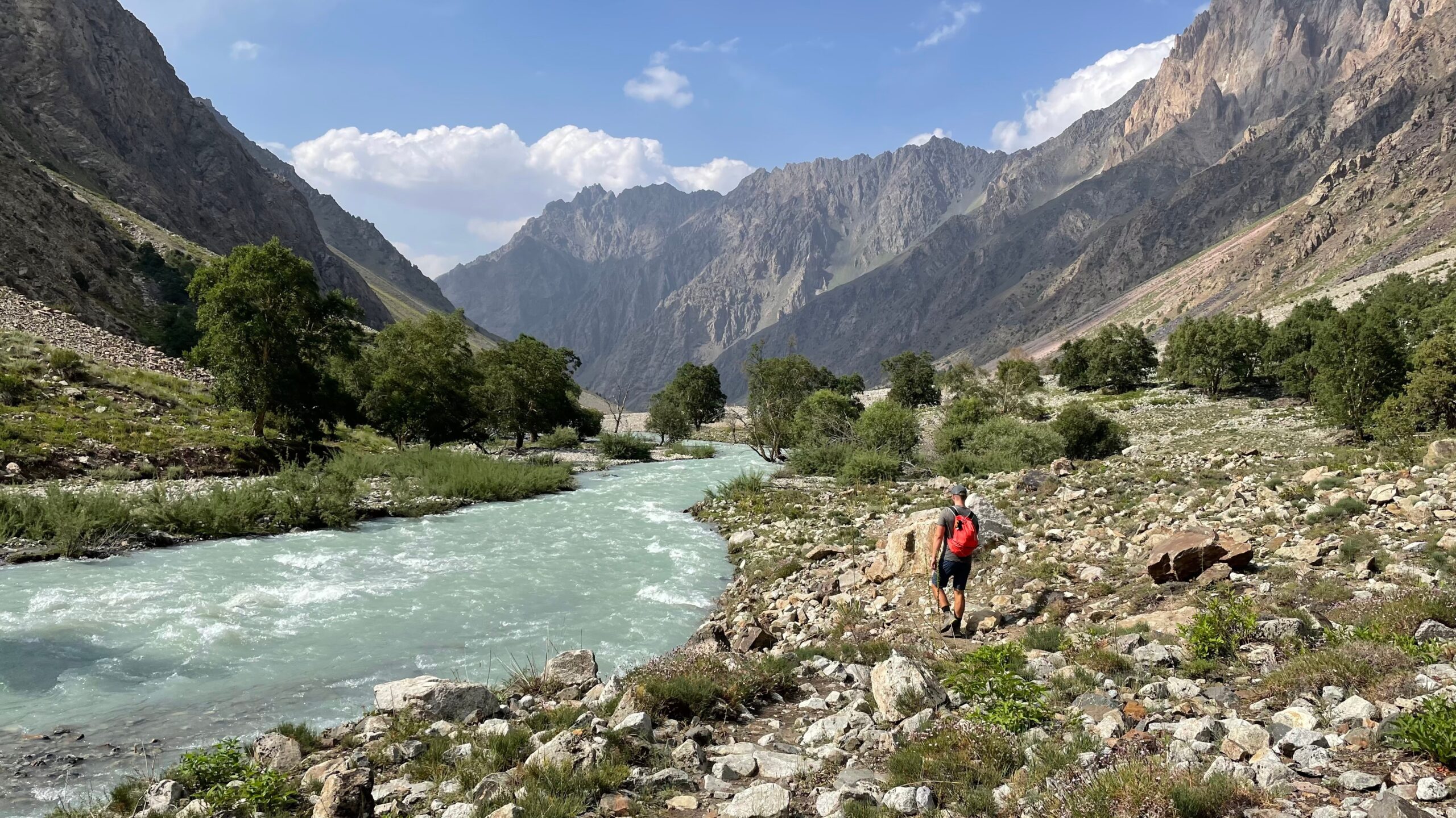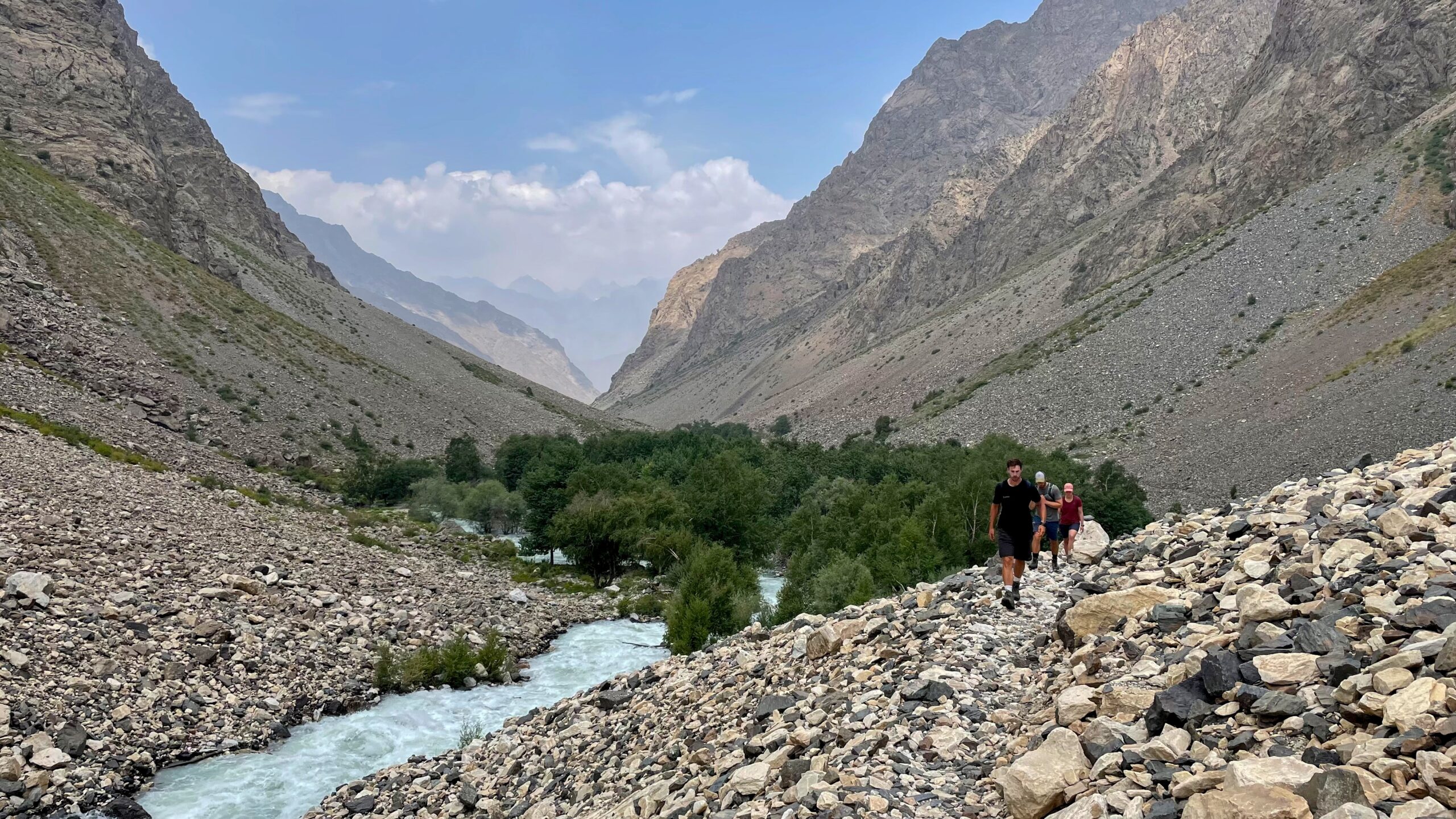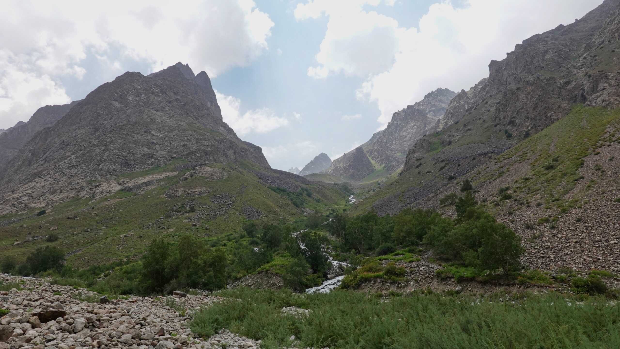 Pokračujeme ve stoupání v úzkém údolí, kdy nás obklopují horské štíty z obou stran. Je zde spousta zeleně, takže rozdíl oproti krajině kolem sedla a ledovce. Tempo máme stále luxusní, takže za další hodinku jsme u „druhého“ jezera. No ono to ani není jezero, spíše rozlitá řeka a provizorní kempoviště. Tak jsme zvědavi, zda ti, kteří mají v plánu dojít k druhému jezeru, ho najdou. 😉 Sem tam se nám trail zcela ztratí, abychom ho za několik desítek metrů znovu našli. Procházíme i kolem opuštěných příbytků pro stáda koz. Za jedním hupem se nám naskytne luxusní výhled do horní části údolí, kterému uprostřed vévodí řeka obklopená zelení a stromy a z obou stran je sevřena kamennými štíty. Krása.