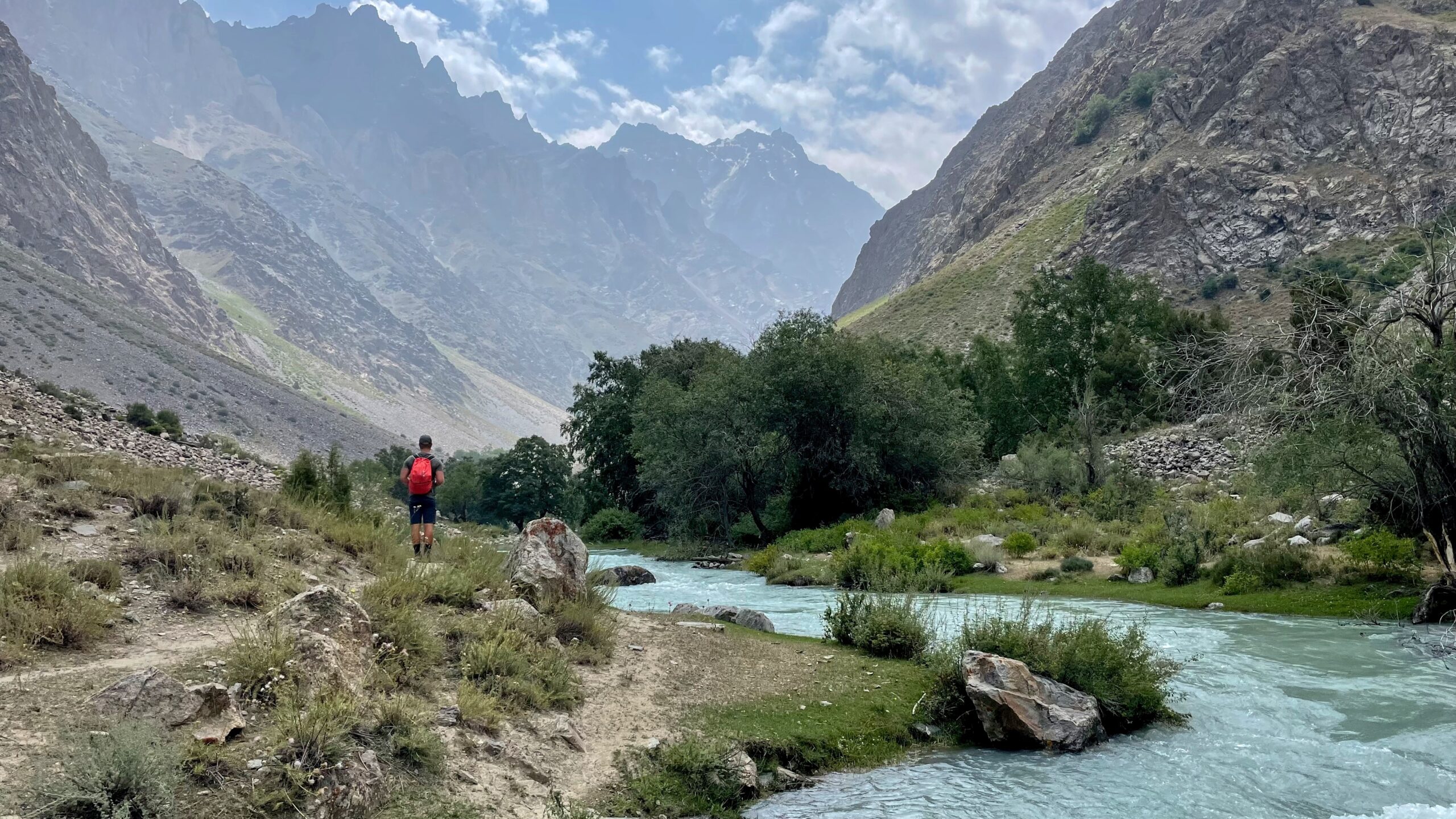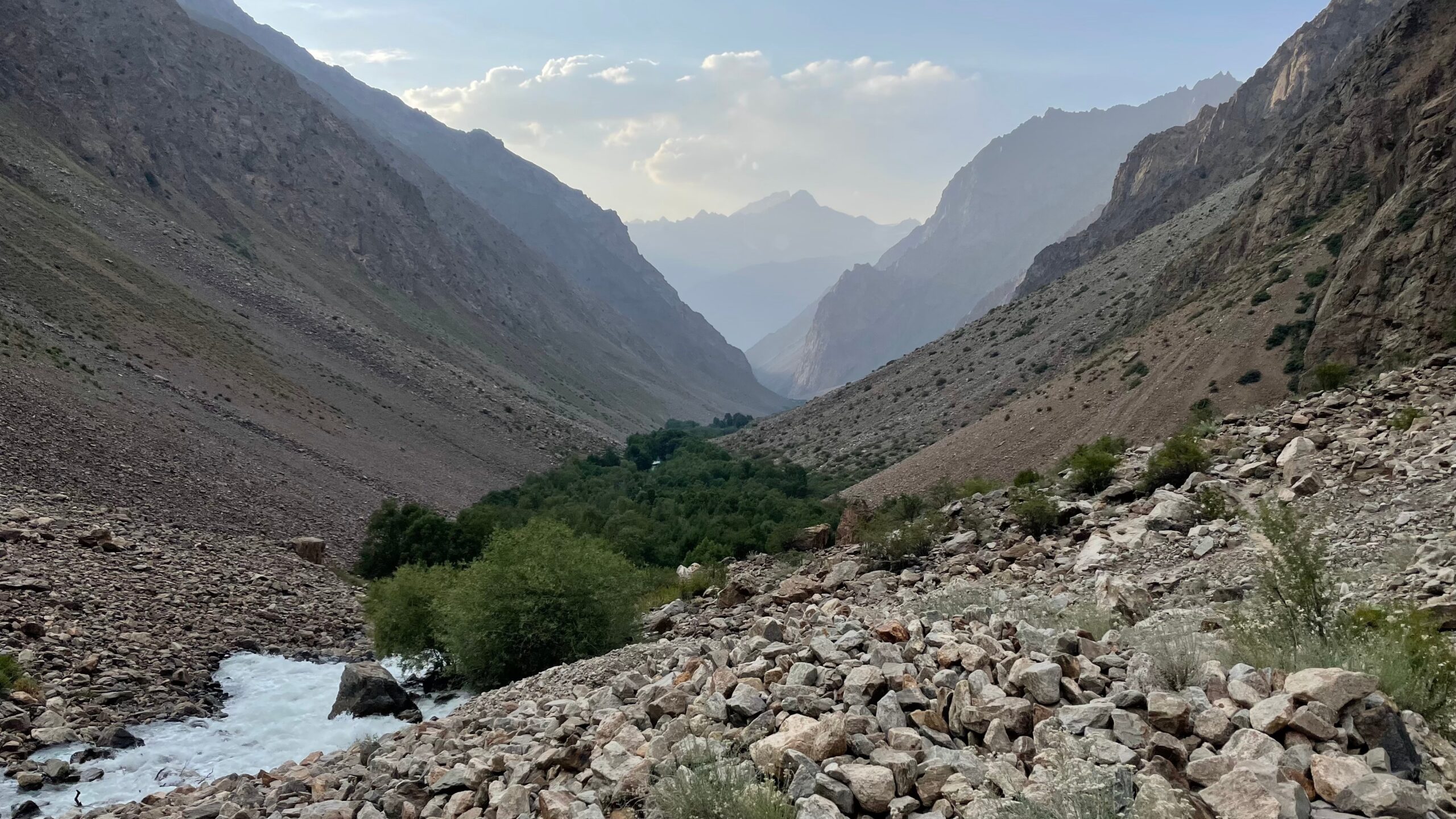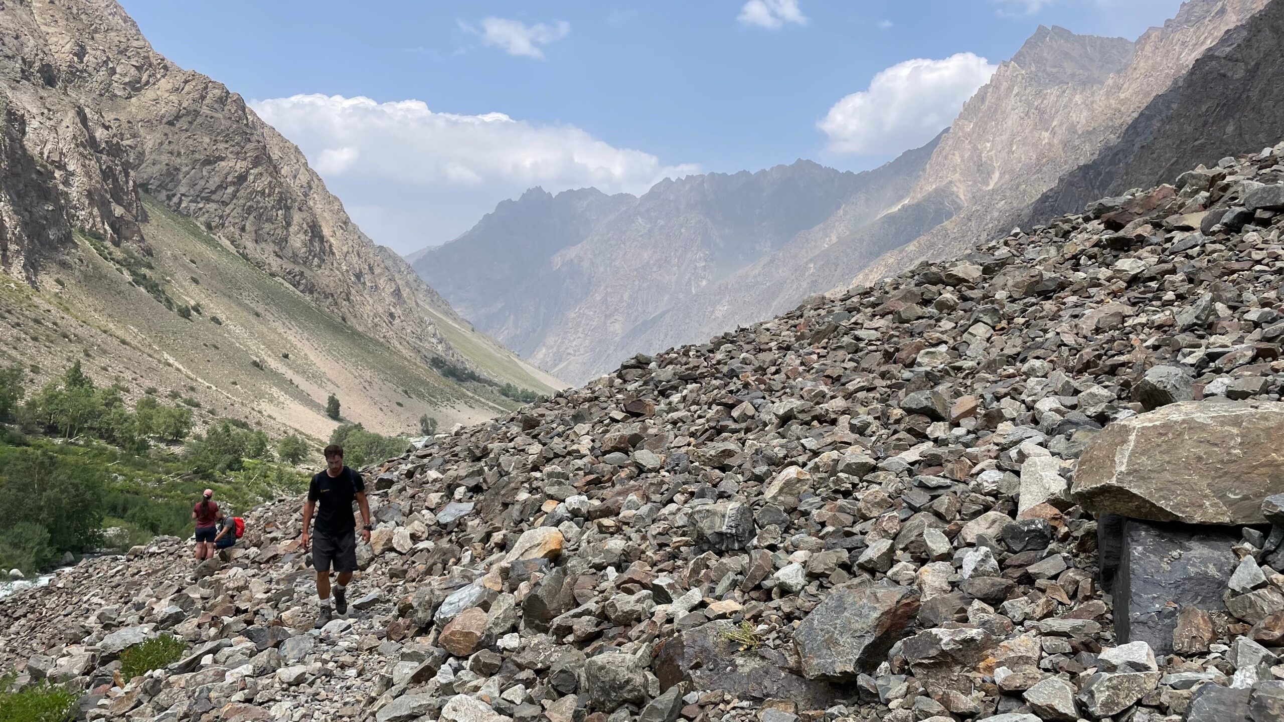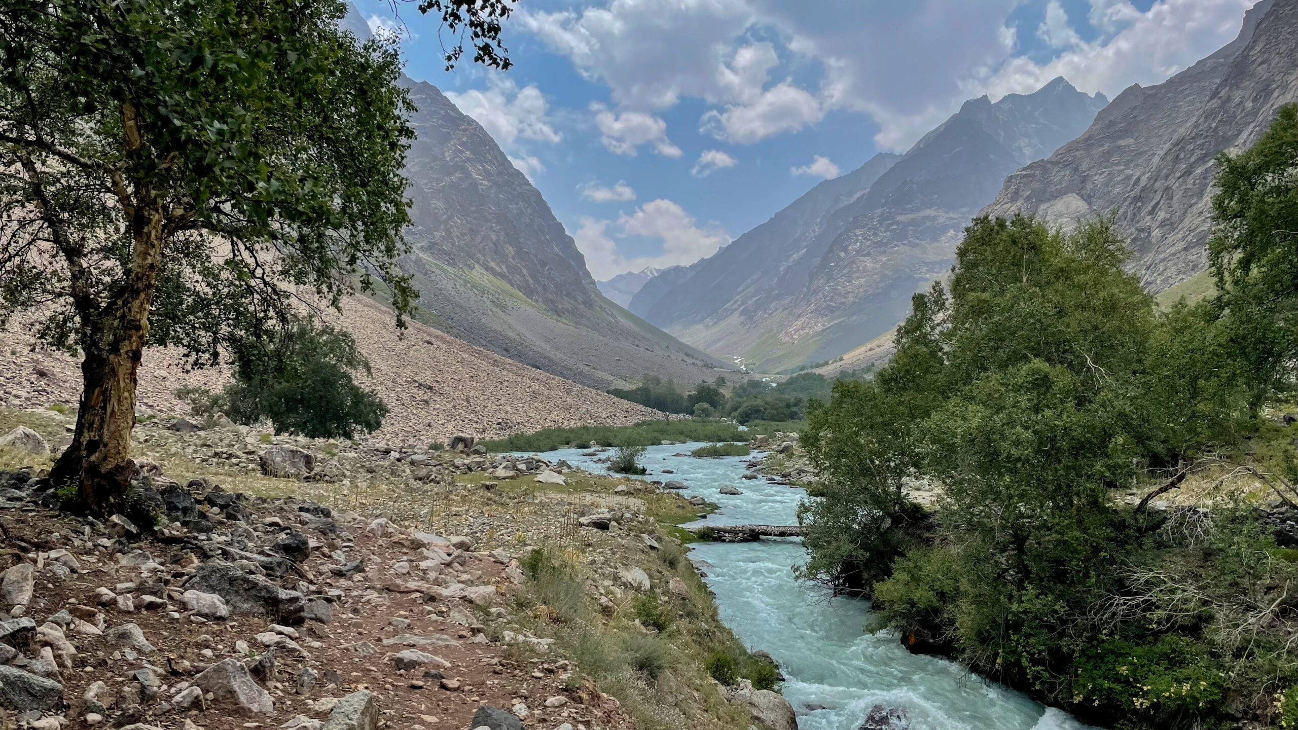 Pokračujeme ve stoupání v úzkém údolí, kdy nás obklopují horské štíty z obou stran. Je zde spousta zeleně, takže rozdíl oproti krajině kolem sedla a ledovce. Tempo máme stále luxusní, takže za další hodinku jsme u „druhého“ jezera. No ono to ani není jezero, spíše rozlitá řeka a provizorní kempoviště. Tak jsme zvědavi, zda ti, kteří mají v plánu dojít k druhému jezeru, ho najdou. 😉 Sem tam se nám trail zcela ztratí, abychom ho za několik desítek metrů znovu našli. Procházíme i kolem opuštěných příbytků pro stáda koz. Za jedním hupem se nám naskytne luxusní výhled do horní části údolí, kterému uprostřed vévodí řeka obklopená zelení a stromy a z obou stran je sevřena kamennými štíty. Krása.