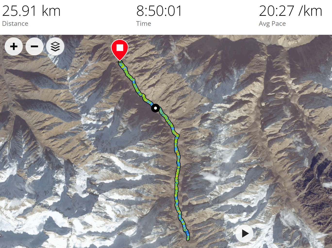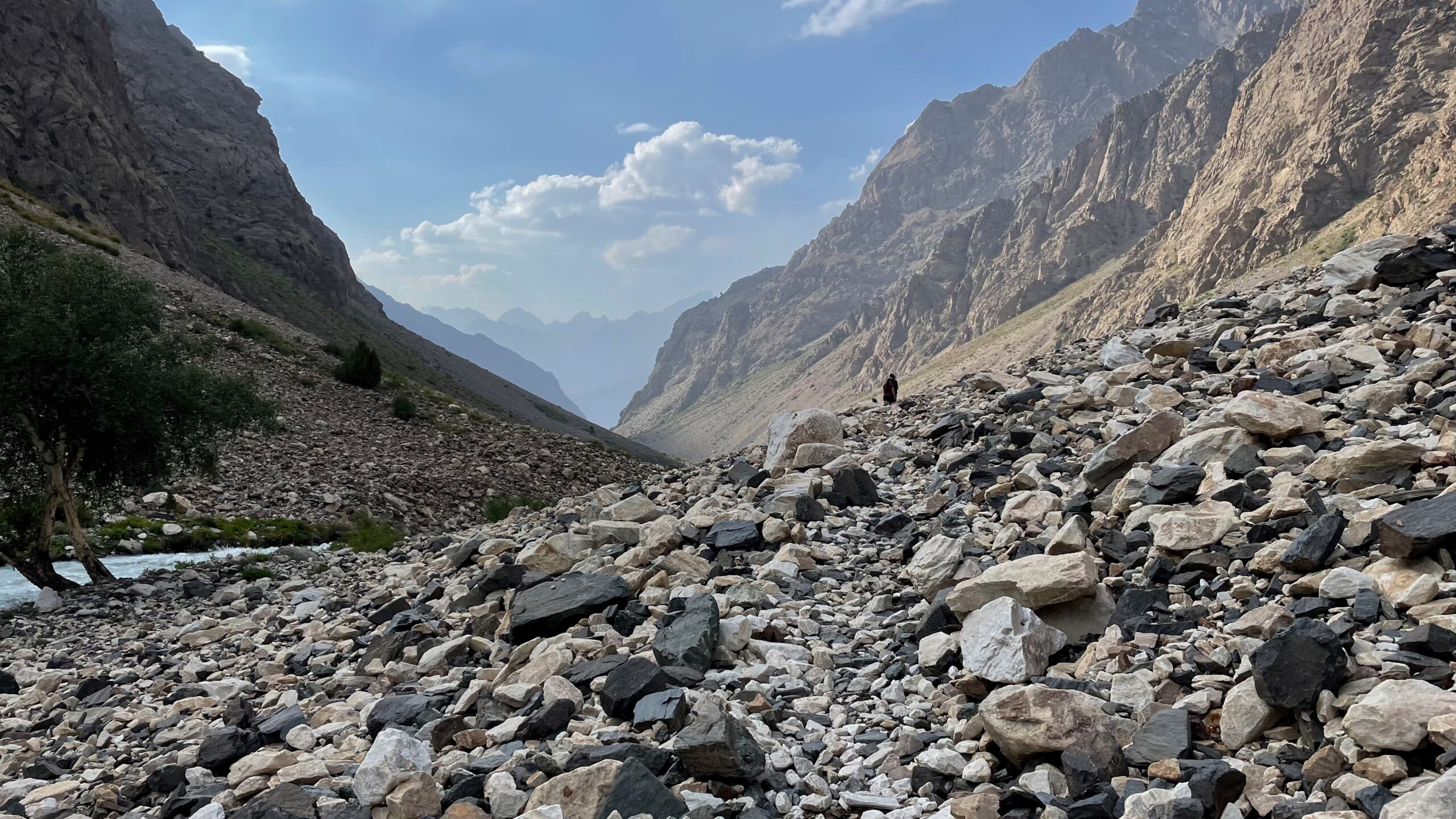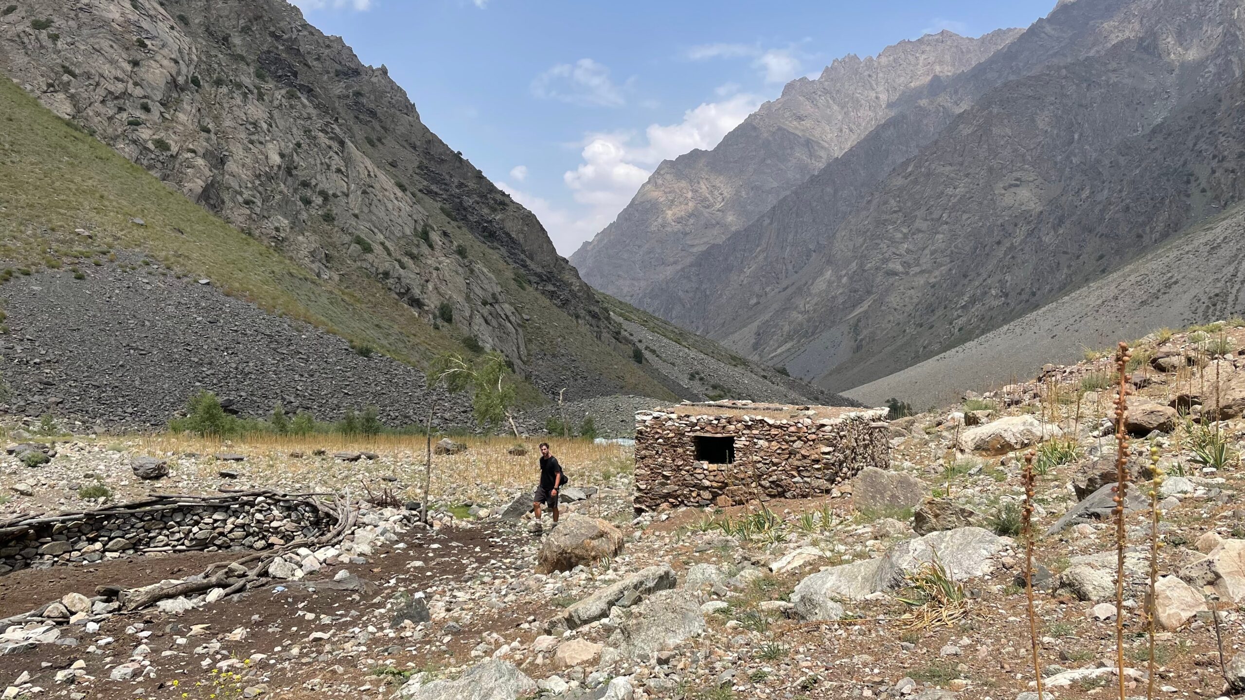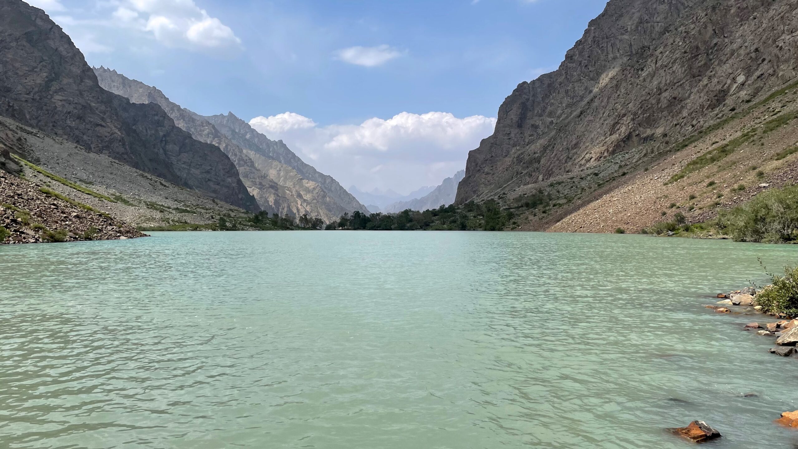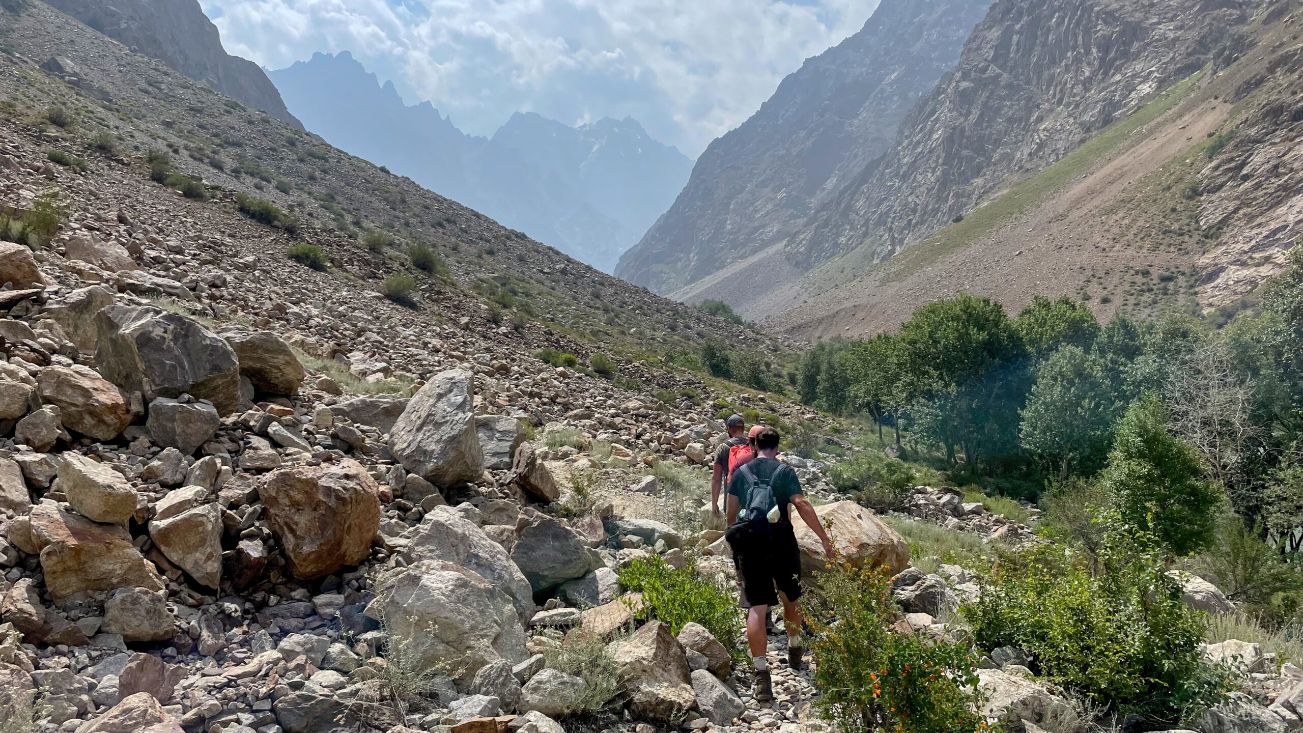 Pokračujeme ve stoupání v úzkém údolí, kdy nás obklopují horské štíty z obou stran. Je zde spousta zeleně, takže rozdíl oproti krajině kolem sedla a ledovce. Tempo máme stále luxusní, takže za další hodinku jsme u „druhého“ jezera. No ono to ani není jezero, spíše rozlitá řeka a provizorní kempoviště. Tak jsme zvědavi, zda ti, kteří mají v plánu dojít k druhému jezeru, ho najdou. 😉 Sem tam se nám trail zcela ztratí, abychom ho za několik desítek metrů znovu našli. Procházíme i kolem opuštěných příbytků pro stáda koz. Za jedním hupem se nám naskytne luxusní výhled do horní části údolí, kterému uprostřed vévodí řeka obklopená zelení a stromy a z obou stran je sevřena kamennými štíty. Krása.