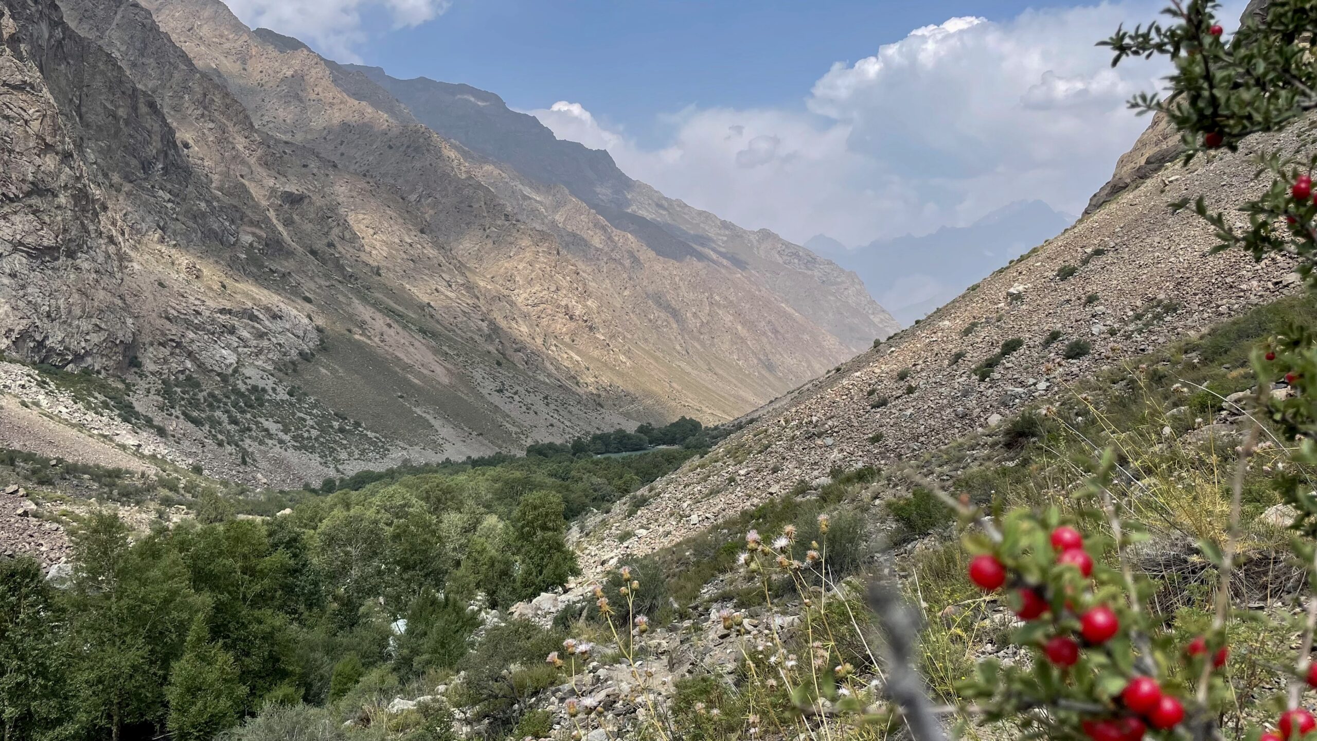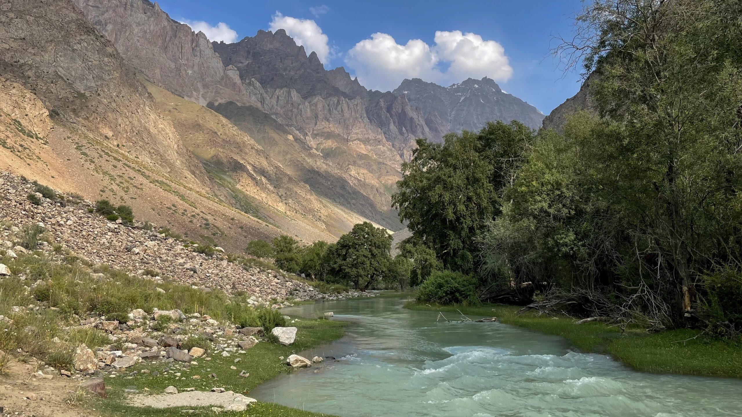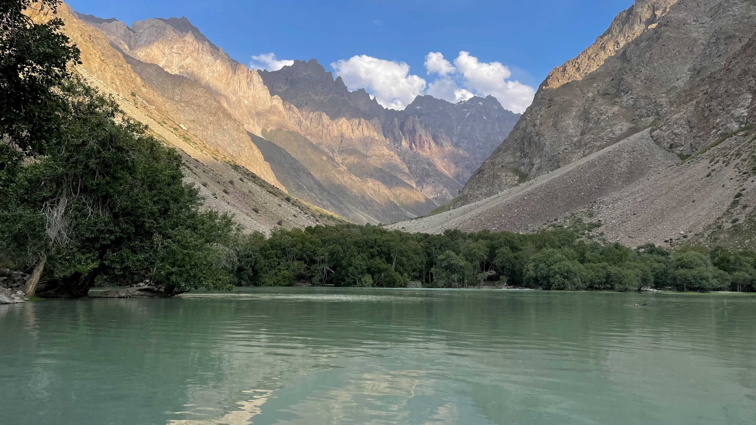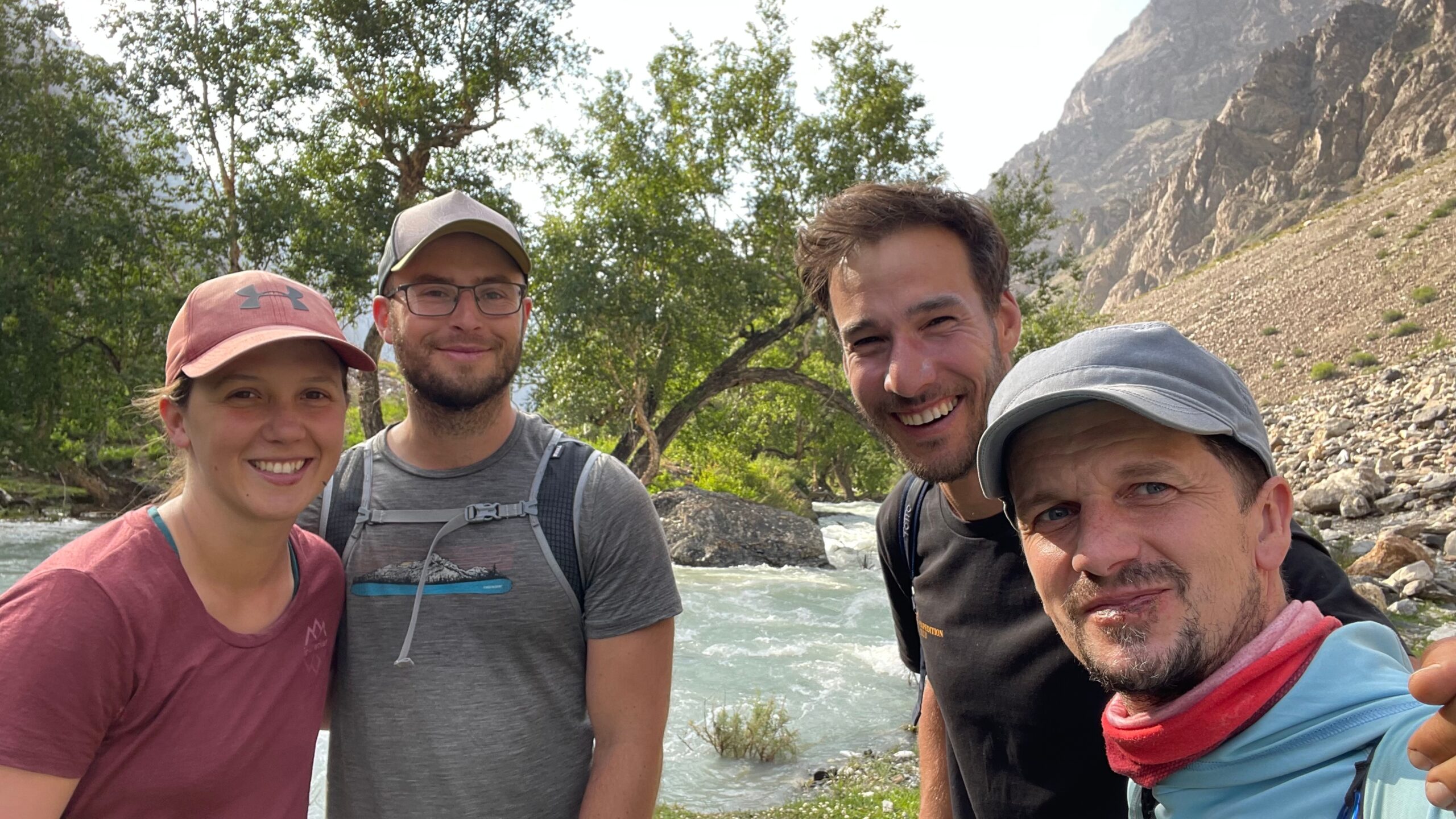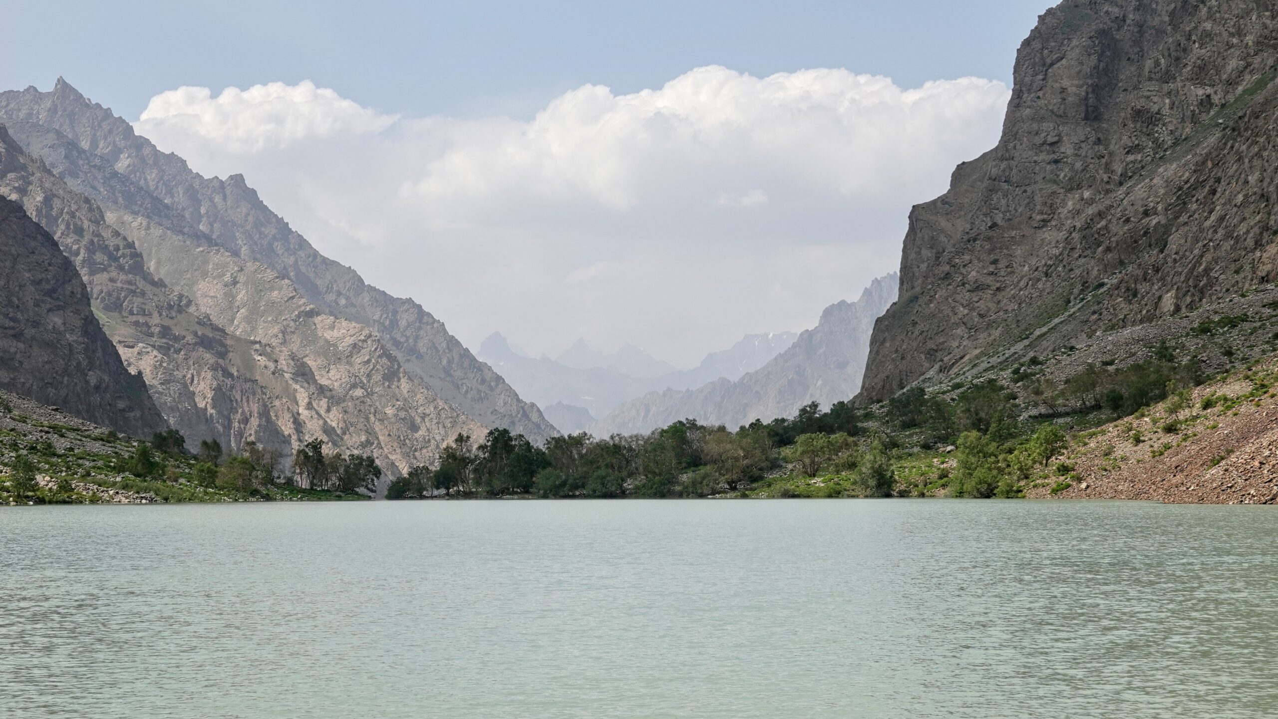 Pokračujeme ve stoupání v úzkém údolí, kdy nás obklopují horské štíty z obou stran. Je zde spousta zeleně, takže rozdíl oproti krajině kolem sedla a ledovce. Tempo máme stále luxusní, takže za další hodinku jsme u „druhého“ jezera. No ono to ani není jezero, spíše rozlitá řeka a provizorní kempoviště. Tak jsme zvědavi, zda ti, kteří mají v plánu dojít k druhému jezeru, ho najdou. 😉 Sem tam se nám trail zcela ztratí, abychom ho za několik desítek metrů znovu našli. Procházíme i kolem opuštěných příbytků pro stáda koz. Za jedním hupem se nám naskytne luxusní výhled do horní části údolí, kterému uprostřed vévodí řeka obklopená zelení a stromy a z obou stran je sevřena kamennými štíty. Krása.