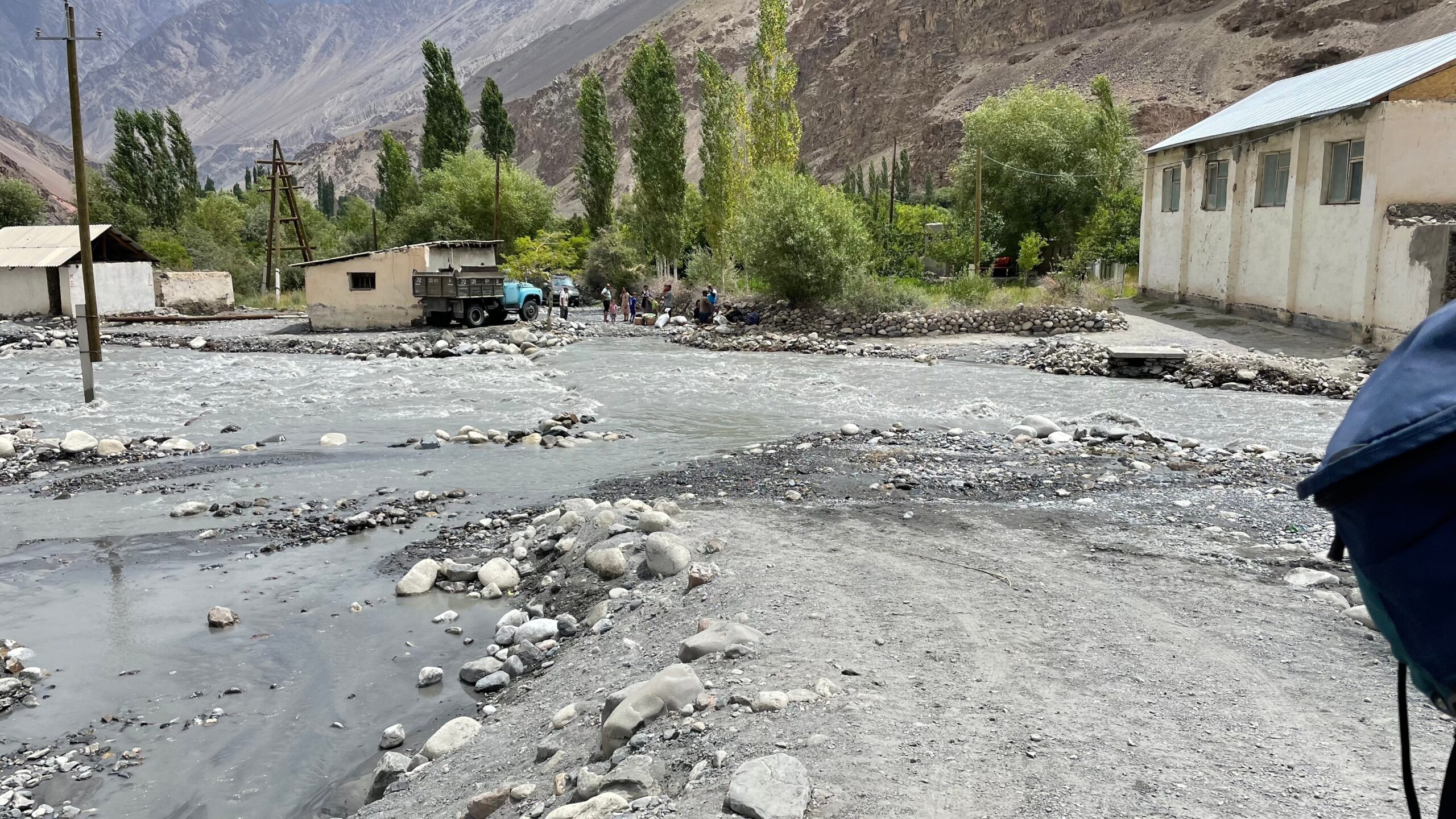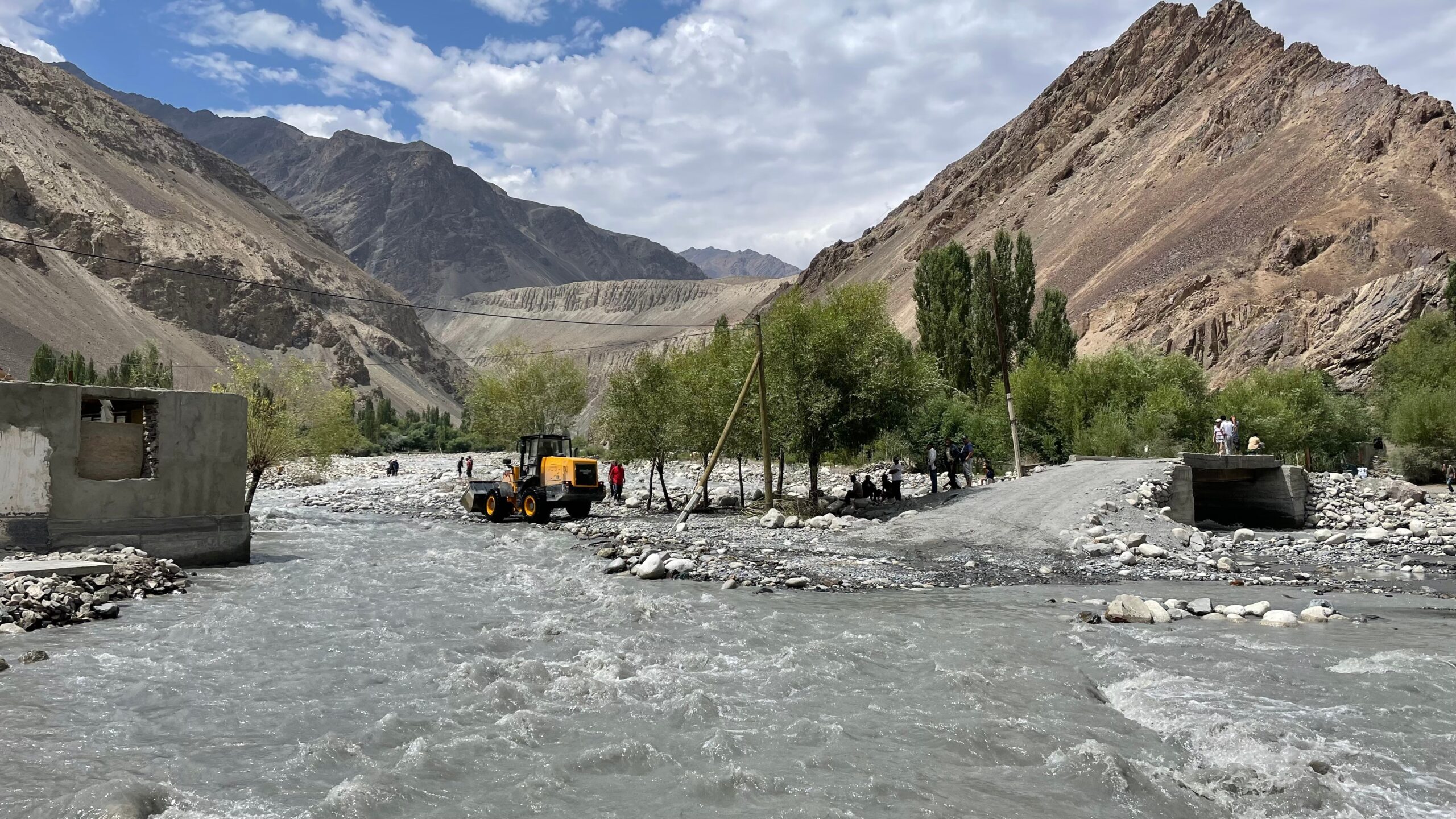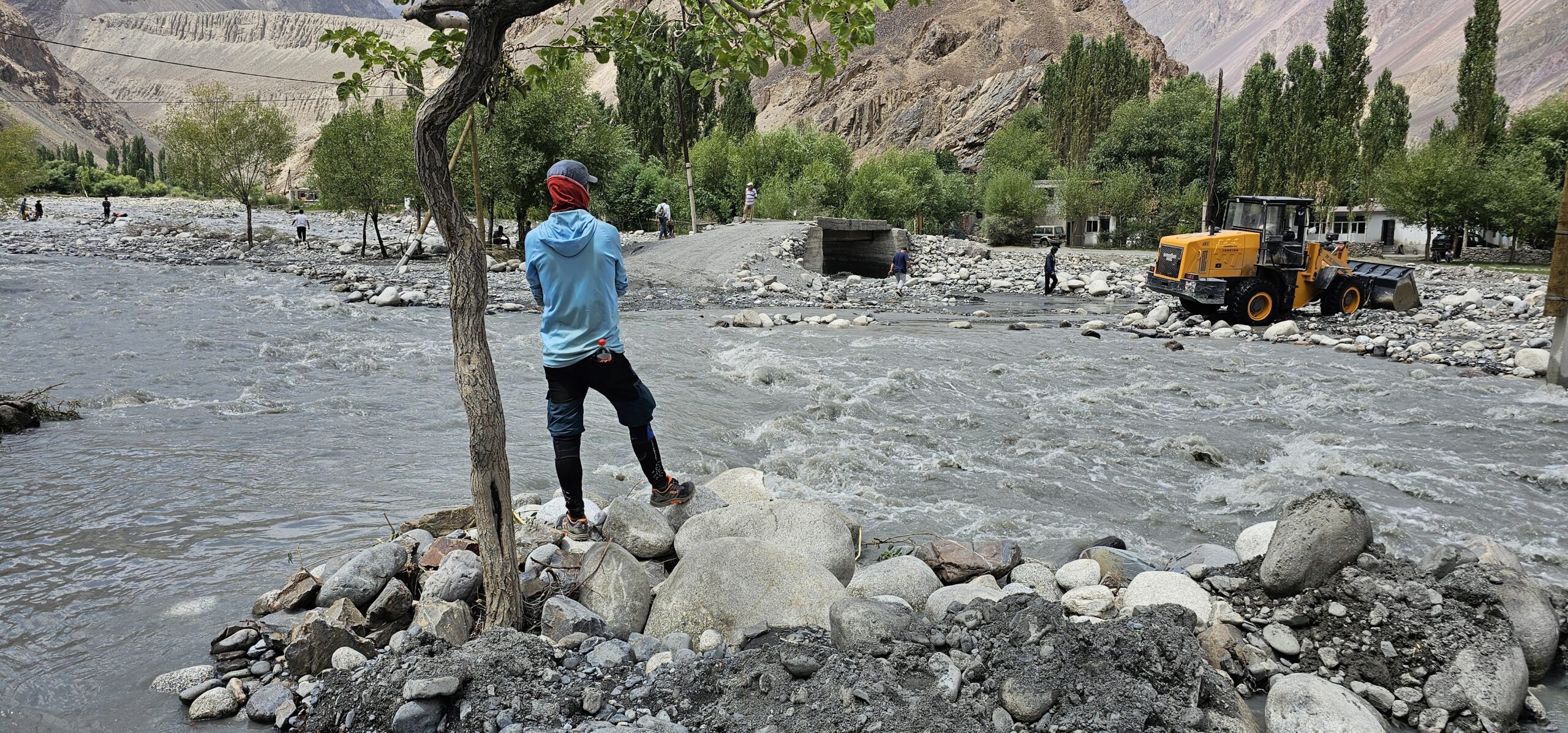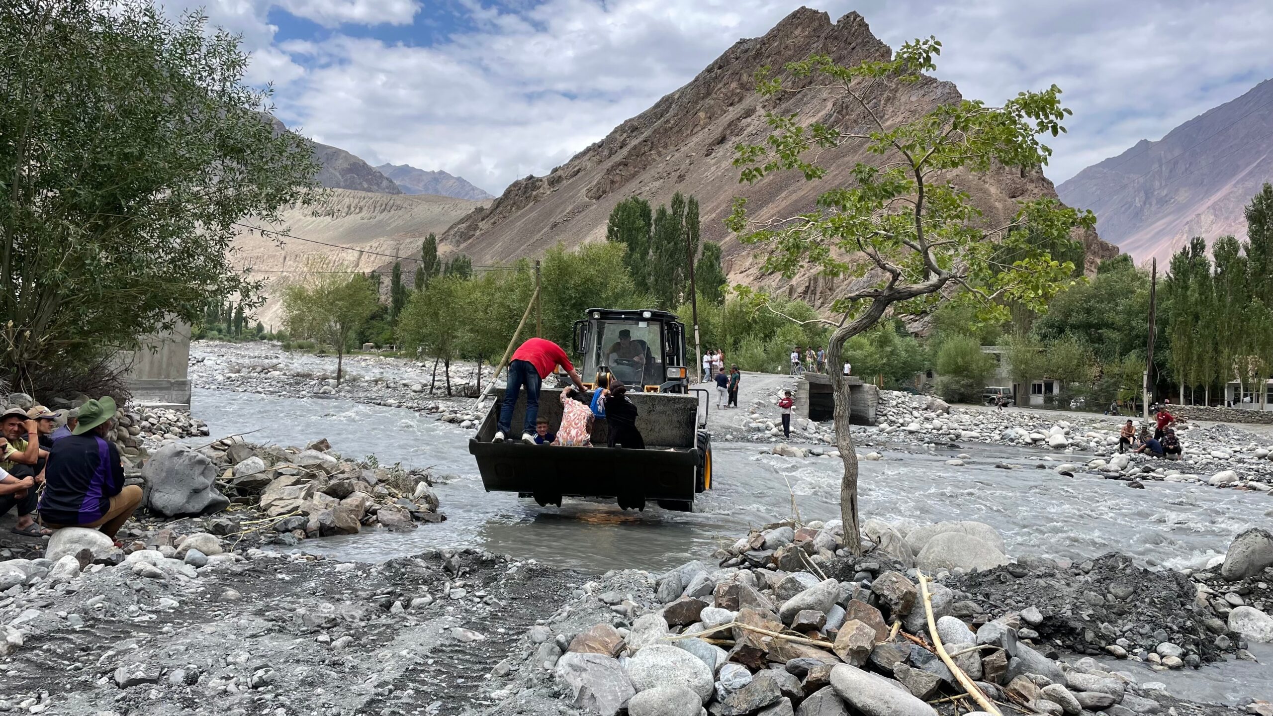 Sjezd na hlavní tepnu byl opravdu výživný, ale zvládli jsme to. Pokračujeme po hlavní tepně a po pravé straně vidíme solidní řeku. Za cca 45-50 minut proti nám jede auto, které zastavuje a náš řidič se baví s druhým řidičem. Pak se otočí na mě, řekne něco rusky, překříží ruce a ukazuje dopředu. I když nerozumím rusky, tak pochopím, že vepředu je něco, co podle všeho neprojedeme. Já mu anglicky (i když tomu řidič nerozumí 😀 ) říkám, že má dobré auto, že to zvládneme. Za chvilku dorazíme k místu, kde proti nám stojí tatra a je jasné, že dál to jen tak nepůjde. Vystupujeme, abychom zjistili, co přesně se děje. Po včerejších vydatných deštích se rozlila řeka mimo most a je to neprůjezdné. Na obou stranách rozlité řeky jsou „diváci“ a čeká se, co bude. Za chvilku se s námi dá do řeči jeden místní, který umí velmi dobře anglicky. Vysvětluje nám, že se snaží nakladačem zahrnout místo, kde se to protrhlo. Prosím ho, ať se zeptá našeho řidiče, zda s námi řidič počká, až se to zahradí a budeme pokračovat. Řidič je s tím ok, a tak vyčkáváme. Nakladač s dalšími místními nabírá velké šutráky kolem břehu a vozí je nahoru k místu protržení. Bohužel to vypadá, že tohle bude běh na dlouho trať. Bavíme se s „naším překladačem“, jaké máme možnosti a borec nám navrhuje, že zkusí zjistit, zda někdo nejede za brodem směr Rushan. Když je za brodem, tak z druhé strany přijíždí 4×4 auto. To vypadá nadějně. Borec za chvilku znovu brodí zpátky k nám a říká nám, že prohodíme posádky – my půjdeme do toho auta na druhém břehu a oni do našeho. Paráda. Nyní je nutné si domluvit cenu, kterou dáme prvnímu řidiči. Vůbec netuším, jak daleko jsme, a tak říkám, ať si řekne cenu. Řidič chce 300 SOMů. Do toho samozřejmě vstoupí mistryně smlouvání Blanka a nakonec z toho bylo 250 SOMů. 😉 Ale jak se dostaneme na druhý břeh? Nakonec jednoduše – nakladačem!!! 😉 Nakladač nabral do lopaty zboží a posádku z druhé strany a převezl je k nám. Pomůžeme jim vyložit náklad a nyní nastupují do lžíce běloši z Evropy. 😀 Borec lžíci lehce zvedne, takže ještě hlouběji zaplujeme do lžíce a pomalu s námi couvá zpátky na druhý břeh. NEOPAKOVATELNÝ ZÁŽITEK! Tohle prostě v Evropě nemáme šanci zažít. Já vím, bezpečnost v podstatě nula, ale zážitek 100/100. 😉