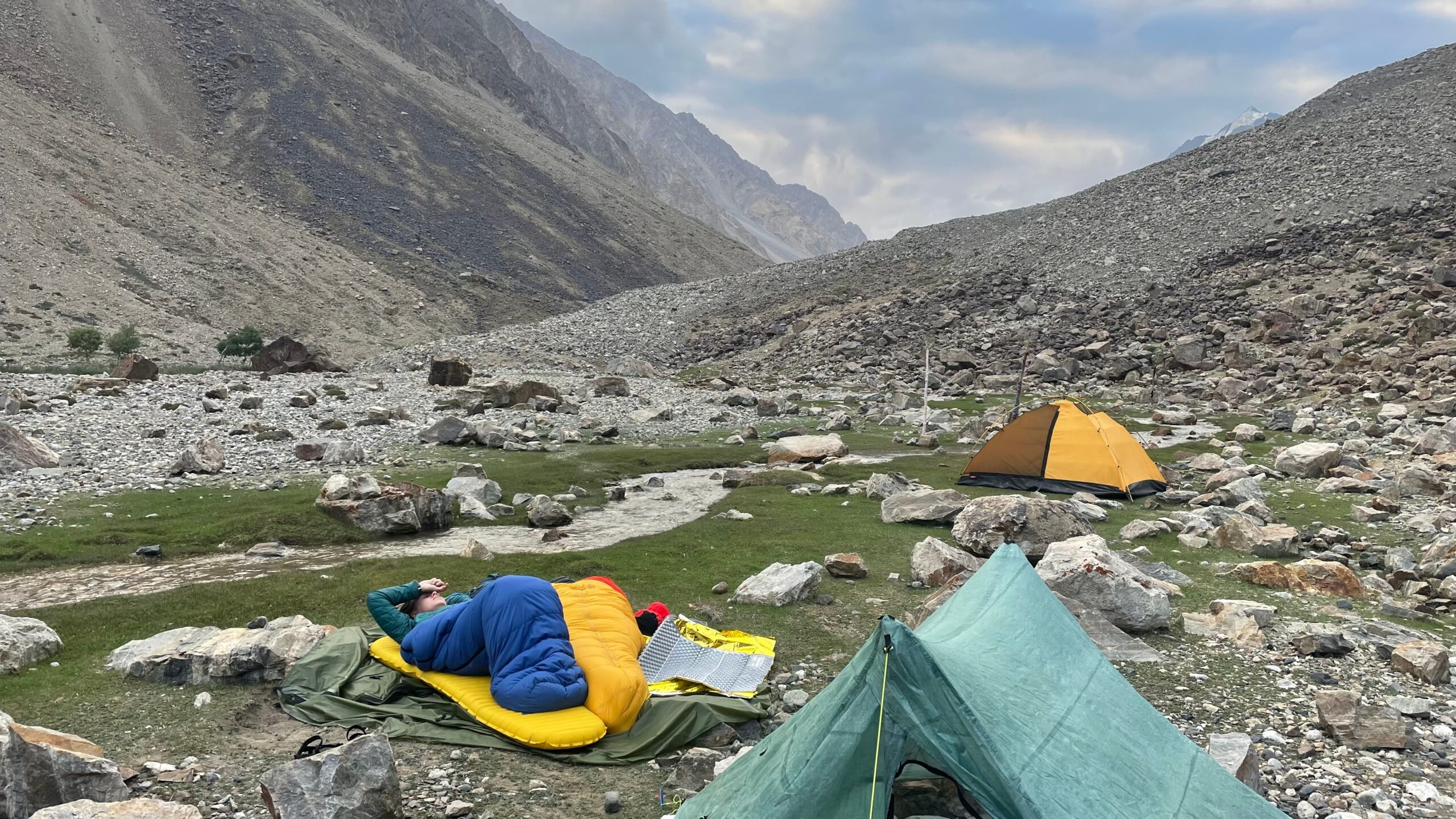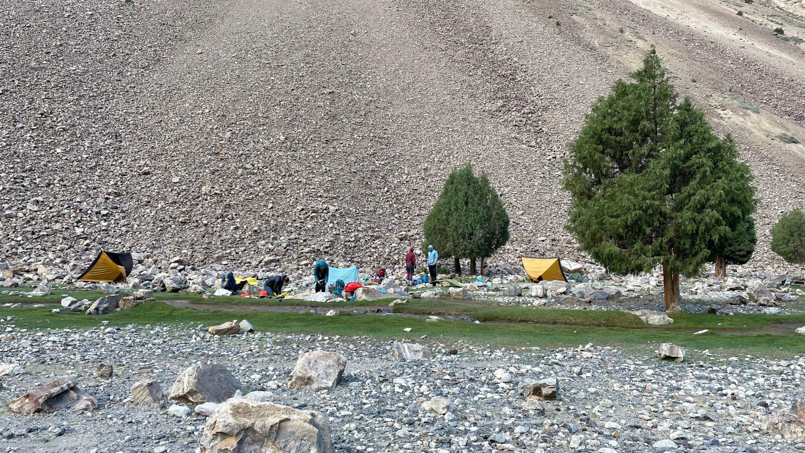 Vaříme si snídani a já poprvé zkouším vajíčka. Už jsem věděl, že musím nalít do sáčku přesné množství vody, jinak hrozí, že místo smaženice budu mít vaječnou polévku. Vodu jsem trefil, ale vajíčka mě úplně neoslovila. Více mi na snídani vyhovují ty kaše. Během snídaně se samozřejmě suší stany, protože když máme přes noc „vodní postel“, tak je třeba ji ráno vysušit. 😀 Dnešní ráno bylo „zajímavé“ i z jiného hlediska. Komáři. Otravní komáři.. Velmi otravní komáři… Já jsem měl celkem klid (asi nemám tak sladkou krev), ale ostatním doslova pili krev. To mělo za následek, že ranní kolečko bylo mega rychlé. Dokonce bych řekl, že si tady někteří udělali svůj osobák. 😀 Blanka s Kristy vystartují jako první, a že počkají někde níže, kde nebudou ty krvežíznivé bestie. Já je za chvilku následuji a komáří peklo jako poslední opouští Zuzka a Kuba.