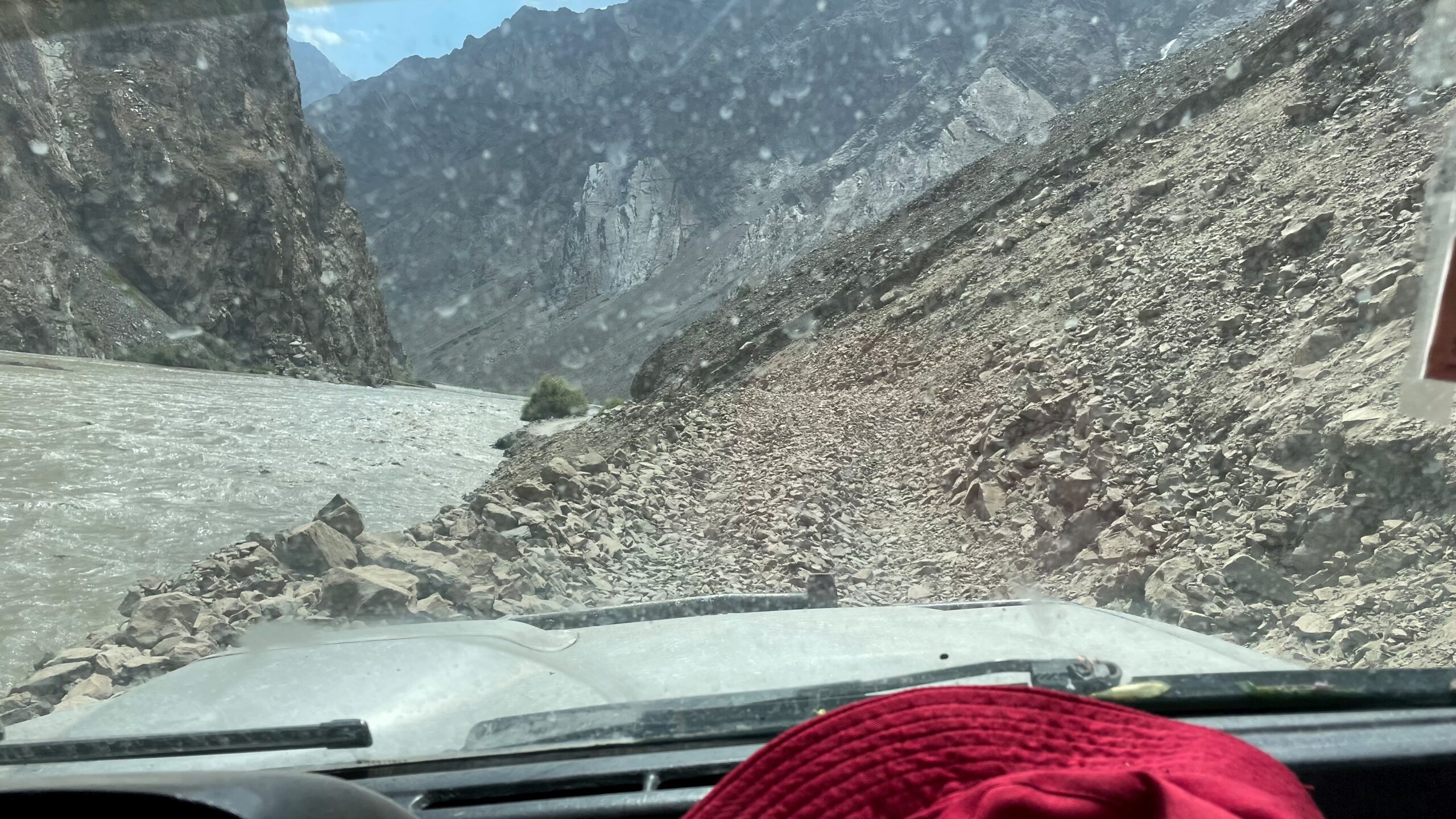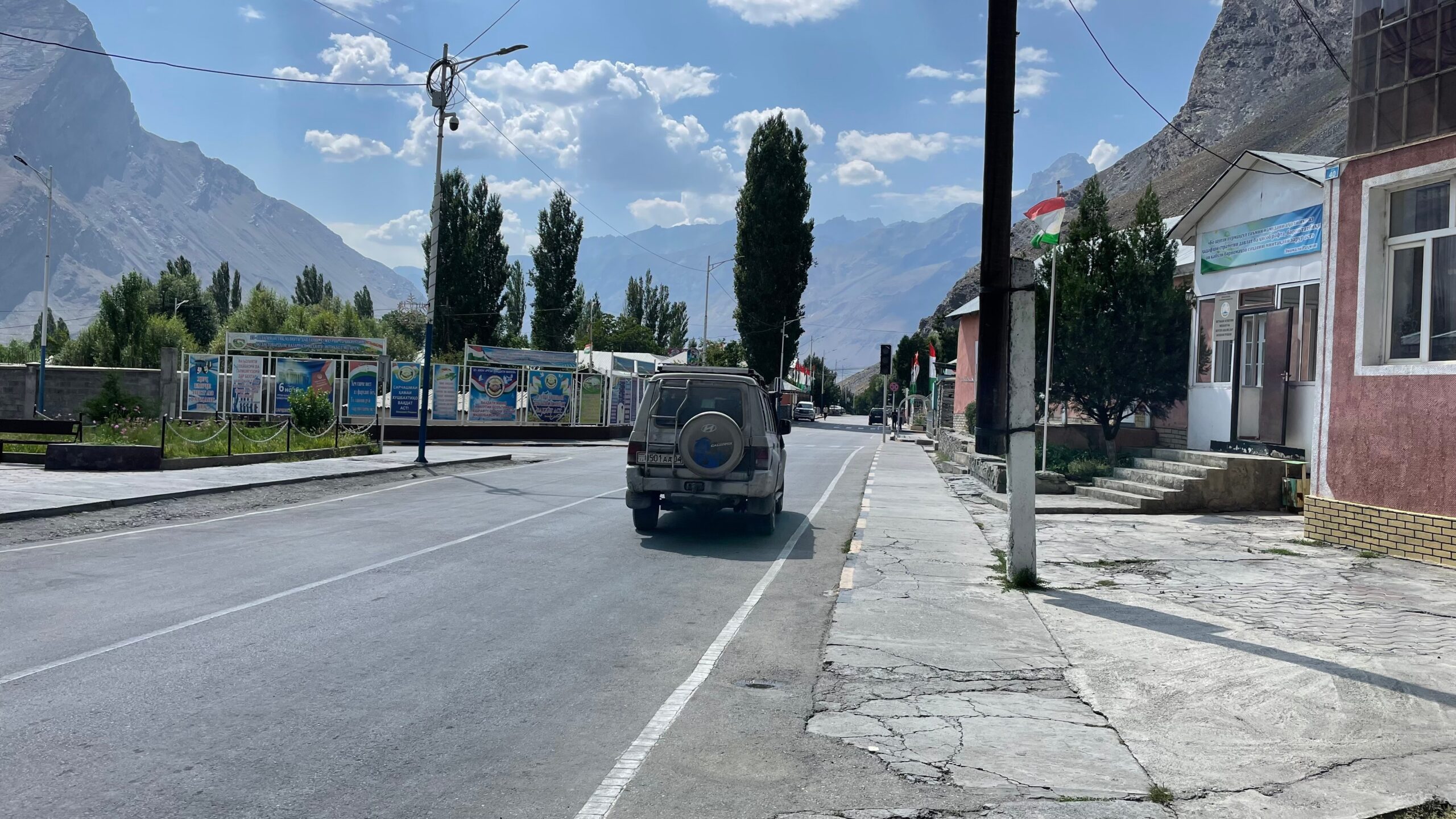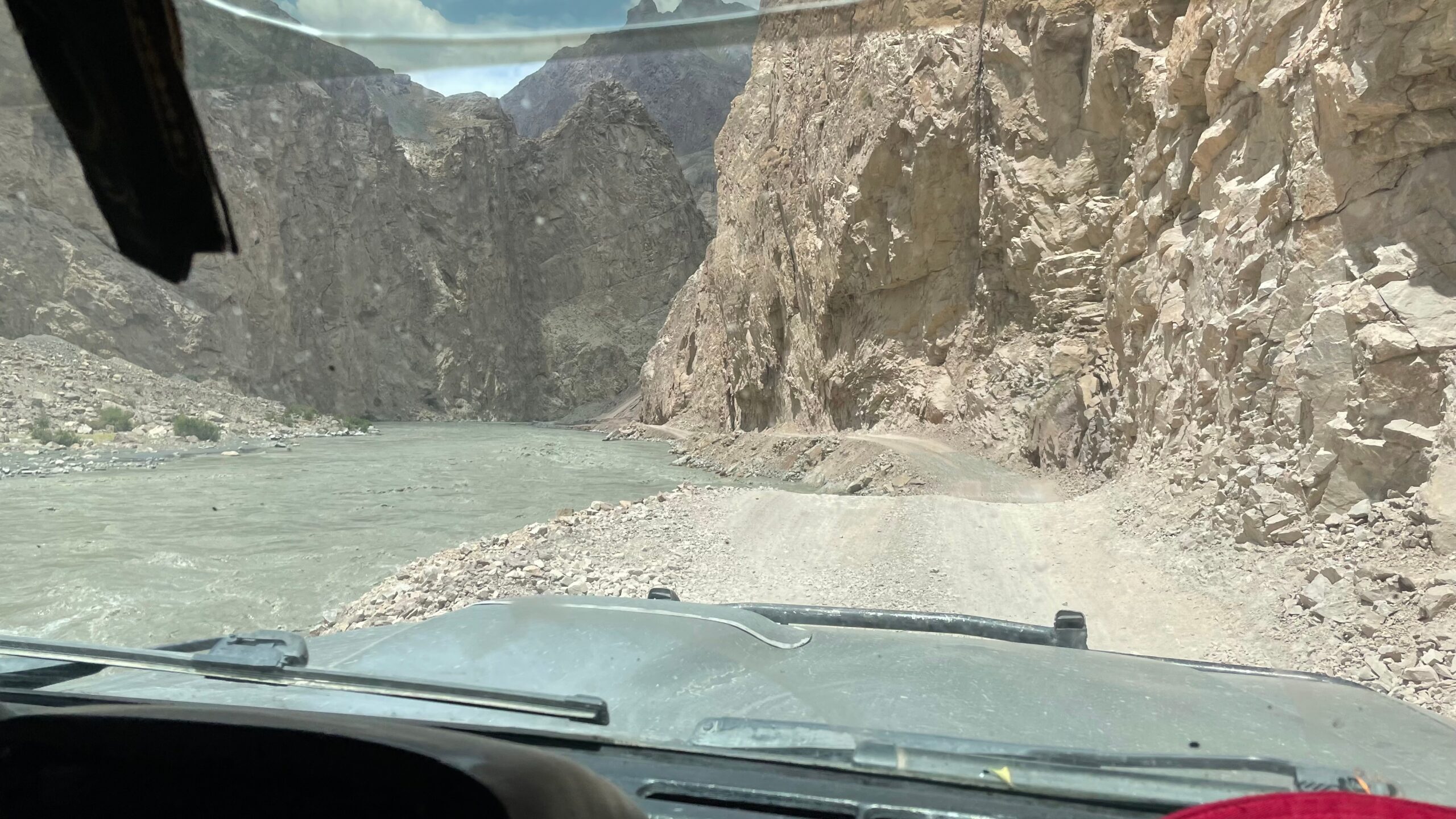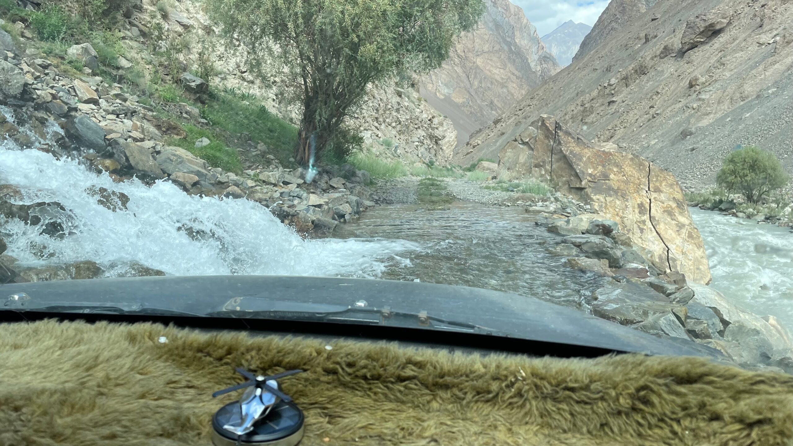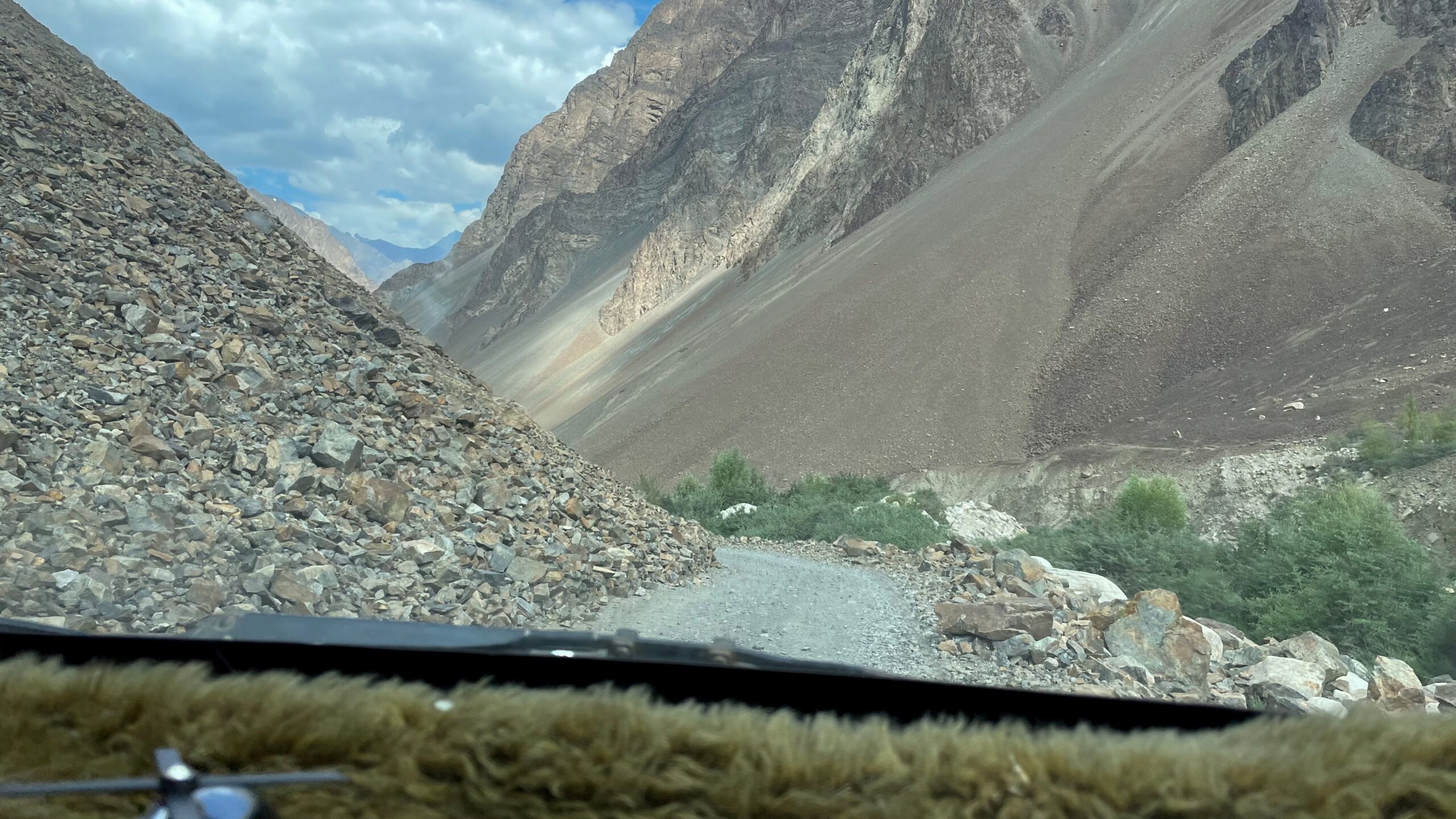 Na druhé straně nám borec (překladač) domlouvá cenu 500 SOMů, jak jsme se bavili, a poté se loučíme. Moc mu děkuji, protože nám velmi pomohl. V druhém autě máme batohy uvnitř na zadní sedačce, kde jim dělá společnost Zuzka a já mám svůj batoh vepředu mezi nohama. Nebyl čas řešit střechu – byli jsme rádi, že jedeme. Pokračujeme tedy dál směr Rushan a já si všimnu, že nefunguje jak tachometr, tak otáčkoměr. To je klasika, to není nic neobvyklého. Co mě trochu znervózňuje je ručička stavu nádrže, která ukazuje, že jsme skoro na rezervě. Ale když po hodině cesty je ručička pořád na stejné místě, tak se uklidním. Ani tato ručička nefunguje. 😀 Řidič mi připravil i jeden zajímavý zážitek, kdy jede a dívá se skrz mě nahoru do ostré kamenné stěny, zda něco nepadá. Rebel. Během jízdy ho sleduji a zjišťuji, že tuhle cestu zná jako své boty. Přesně ví, kdy má zpomalit, kdy vyhodit rychlost, kdy naopak může přidat. Stav cesty je samozřejmě masakr, takže si to opět „užijeme“. Jednou zastavíme, borec mi ukazuje na své doklady a jde k nedaleké budově. Pochopím, že máme vytáhnout pasy, že bude nějaká kontrola. Sesbírám pasy a jdu k budově. Borec zrovna vybíhá ze dveří a ukazuje, že mám jít k autu. Nakonec nějak pochopím, že kontrola byla pro něho. 😀