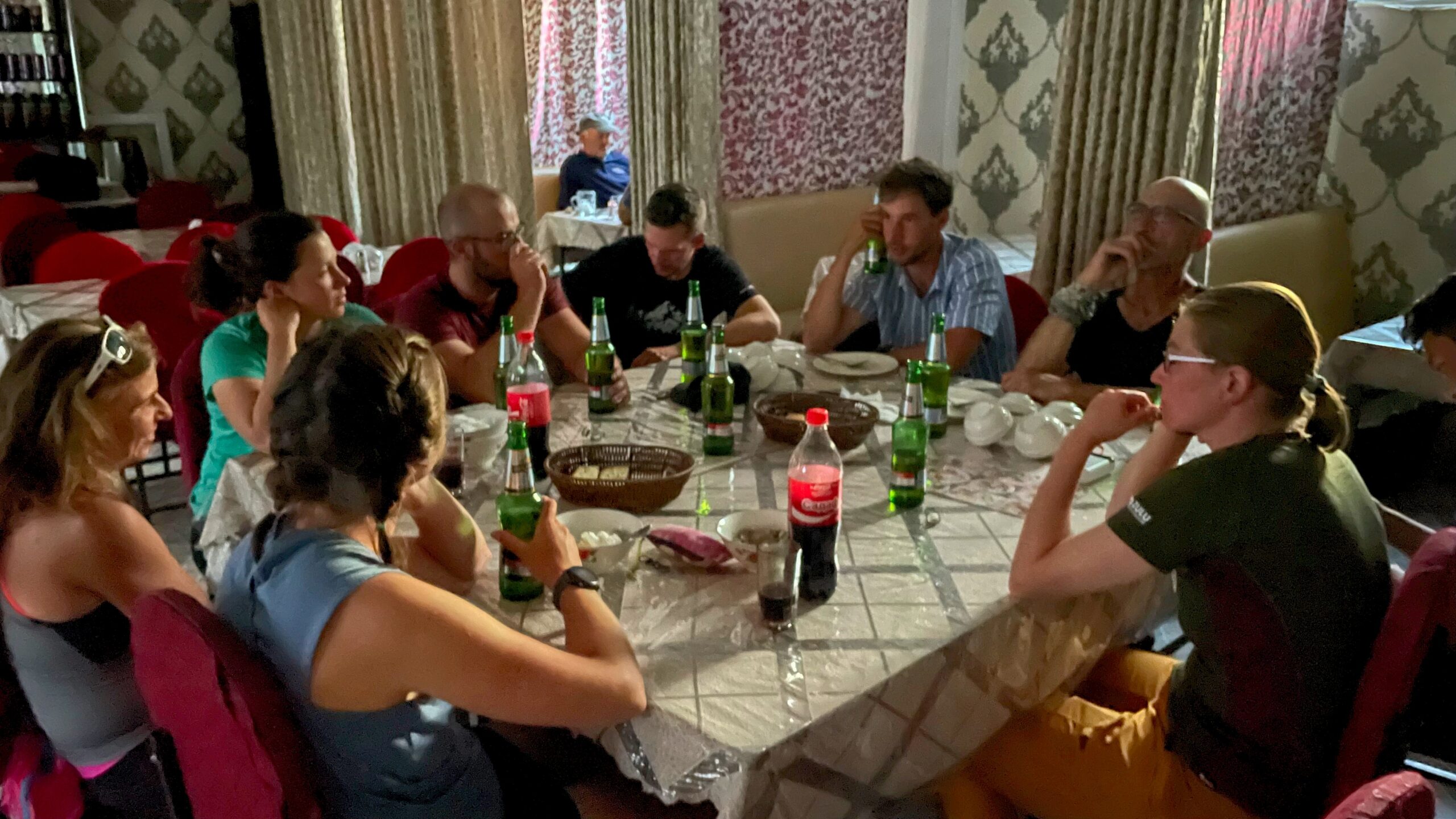 V Rushanu jsme po třetí a necháme si zastavit v centru. Vytáhneme si všechny batohy a já mu platím 500 SOMů. Borec mi začne na prstech ukazovat, že to má být 600 SOMů. Já na něho anglicky, že dohoda byla 500 SOMů, a že bohužel mu více nedám. Chvilku se na sebe díváme, a pak to borec vzdá a odjíždí. Podle posledních informací, co mi psal Jirka na satelitní komunikátor, tak se máme setkat v Guest House. Kristy má data, takže píše na společný chat na WhatsAppu, kde aktuálně jsou. Bohužel žádná odpověď, tak vyrážíme do Guest Housu a uvidíme. Tam o Jirkovi a spol zatím nikdo nic neví, ale můžeme tam počkat. Píšu Jirkovi přes satelitní komunikátor a dozvídáme se, že jsou stále na cestě. Blanka, Kristy a Kuba jdou nakoupit a přinesou odměnu – pivo a chipsy. Nikdo se mě neptá, zda chci nebo nechci pivo, jedno vychlazené dostanu do ruky a zapijeme zdárný dojezd do Rushanu. Během čekání Jirka ještě napíše, abychom zamluvili ubytko pro deset lidí, což hned uděláme. Na pohodu čekáme, popíjíme pivko, ládujeme se chipsama a tu se otevřou železné vrata a dorazí Jirka, Áďa, Lukáš, Tiep a Karel. Opět nás je 10 kousků!!! První věc, kterou potřebujeme co nejdříve ošéfovat je, zda chceme v Jizev údolí strávit 2 nebo 3 dny. 3 dny znamenají, že si ukrojíme jeden den v Dushanbe. Všichni se shodujeme, že raději strávíme jeden den navíc v horách než v té betonové výhni.