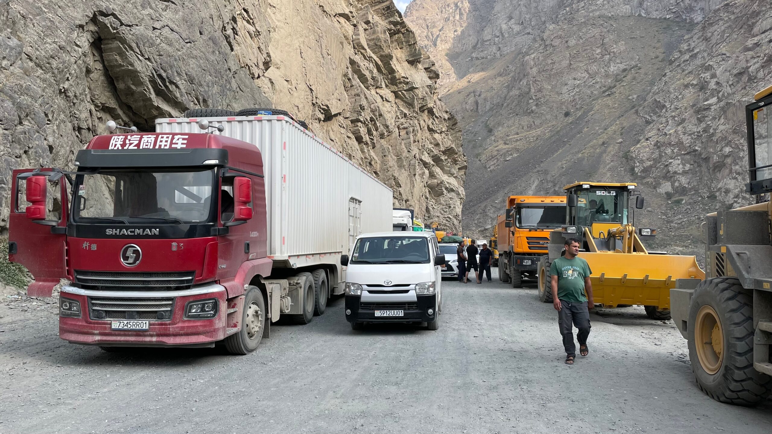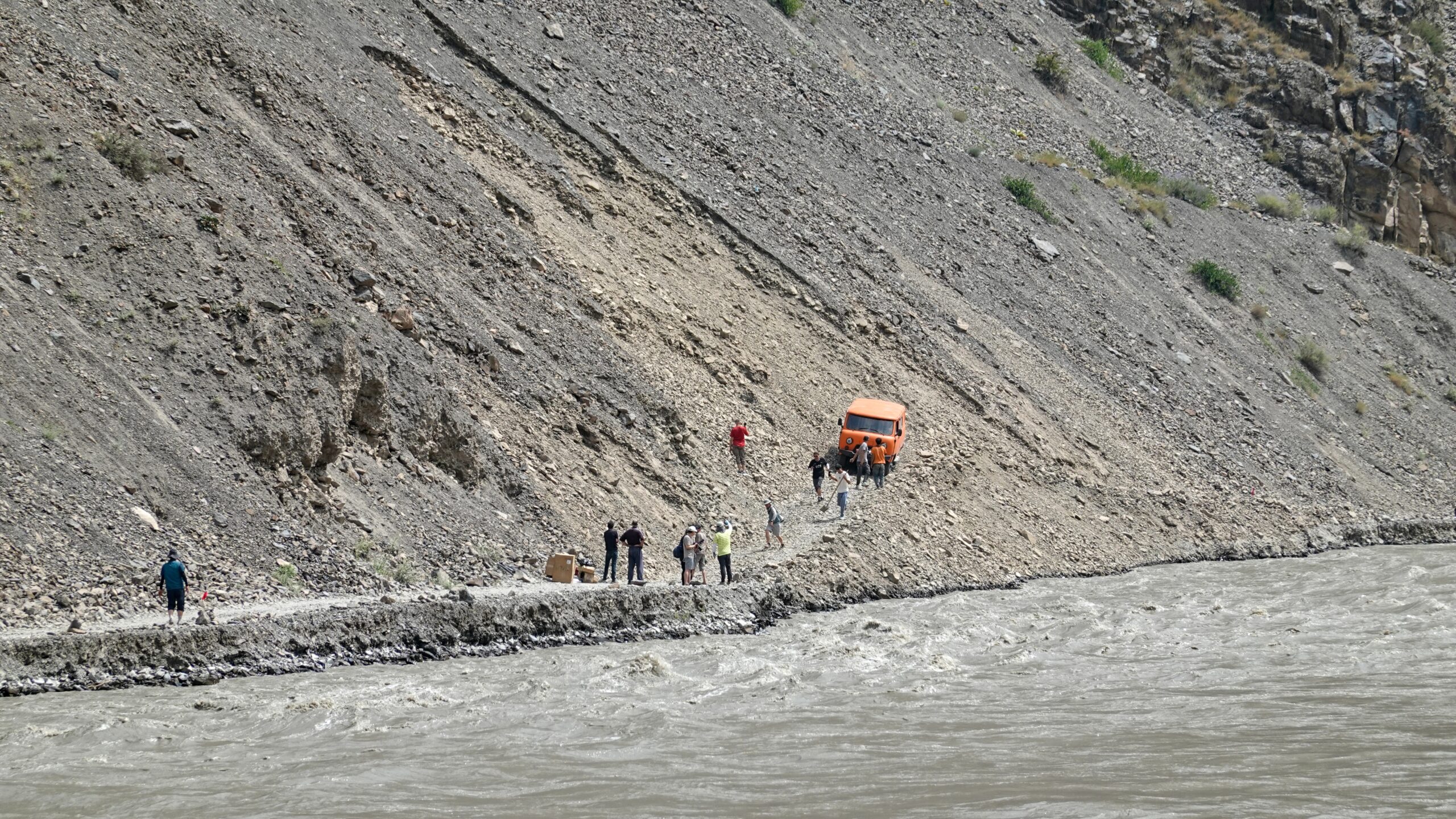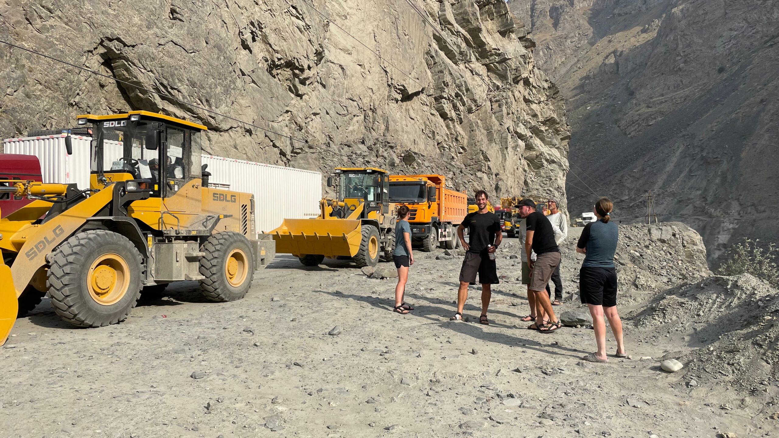Kolem druhé odpoledne zastavujeme na místě, kde jsme v rámci přejezdu z Qalai Khumb do Bulunkul měli pauzu na snídani. Muslim vystupuje a ukazuje nám, že máme jít dovnitř na jídlo. Nejprve mu říkáme, že nemáme ani moc hlad a raději bychom pokračovali dál. Muslim nám ale řekne, že před námi je až do šesti do večera uzavřená cesta, tak není kam spěchat. Ups, tak to jsme nečekali. Jdeme tedy dovnitř a objednáváme si polévku a druhé, což bylo velmi křupavé kuře a hranolky s cibulí. Nejprve jsme si mysleli, že tady zůstaneme opravdu dlouho, ale nakonec Muslim ve tři zavelí, že budeme pokračovat dál. V následující sekci se střídají velmi pěkné asfaltové pasáže s místy, kde se daný cca 20 metrový úsek betonuje a je třeba ho objet. Tak si říkám, zda v těch místech se to trhá, a proto to musí betonovat. Kdo ví. Hlavním tématem v minibuse jsou vytrvalostí sporty, a jak lze zneužít cestovní pas. 😉 Po čtvrté hodině odpolední máme mini pauzu u jednoho krámku, kde si kupuji luxusní mangový džus. Karel si ho taky kupuje, a pak mi říká, že to je z Afganistánu. Afgánci umí. Teplota je stále masakriální, doslova mi to vysušuje bulvy. V 16:45 dorazíme ke koloně stojících aut. Tak tady je ta uzávěra. Muslim se lehce proplete mezi stavebními kolosy (nakladače a tatry) a vypíná motor. Máme cca hodinu, takže nejprve jdeme zkontrolovat, co přesně se před námi děje. Ve svahu stojí několik bagrů, kteří drtí kamennou stěnu a upravují to. Pak různě posedáváme, sledujeme progres či kecáme v autě.