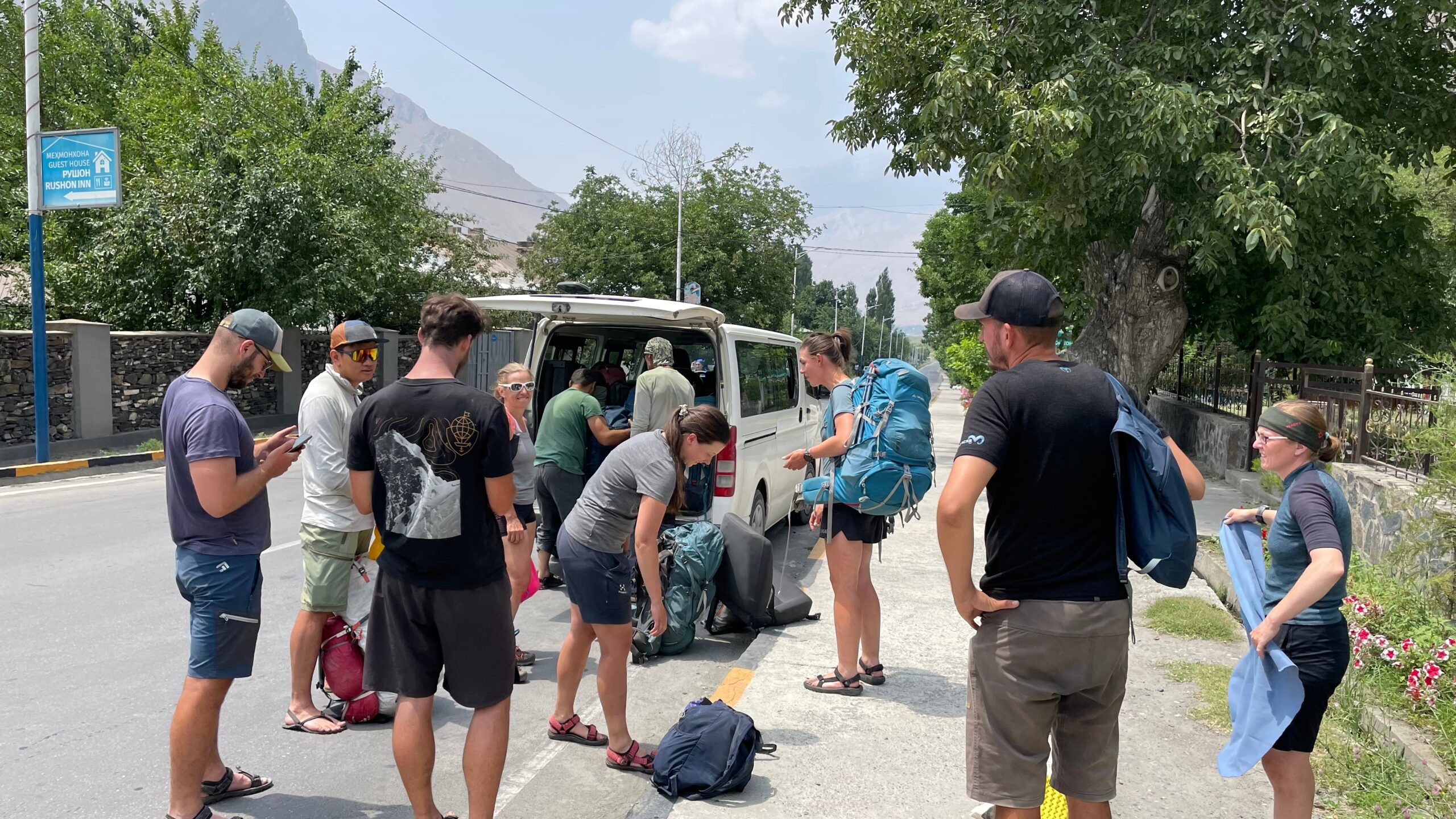 Dole u mostu jsme v půl 11 a vidíme, že na cestě došlo k sesuvu. Naštěstí to je až za mostem, takže náš bílý šíp nebude mít problém se k nám dostat. Sesuv je již lehce upraven, aby se tam dalo nějak projet, ale pořád to není úplně ok. Hlavně když přes foťák a maximální zoom vidím, jak se tam ty auta naklánějí. V jedenáct přijíždí Muslim, my přejdeme most a naskáčeme do minibusu. Zasedací pořádek je již pevně daný a nebudeme ho měnit, že Jirko! 😀 Naše první zastávka bude v Rushanu u Guest Housu, protože si musíme vyzvednout batohy. Do 20 minut v minibuse všichni zalomíme a za necelou hodinu jsme u Guest Housu. Vyzvedneme si batohy, lehce vše přebalíme a přesunujeme se k minibusu. Muslim opět hraje s našimi batohy hru Tetris. Ale tentokrát si lehce pomůže – vytáhne úplně zadní sedačku. Začne nakládat jeden batoh za druhým a my uvažujeme, co jako bude dělat s tou sedačkou. Nakonec sedačku nechává v Rushanu! Můj batoh je už tak malý, že ho hodíme coby poslední kousek nahoru.