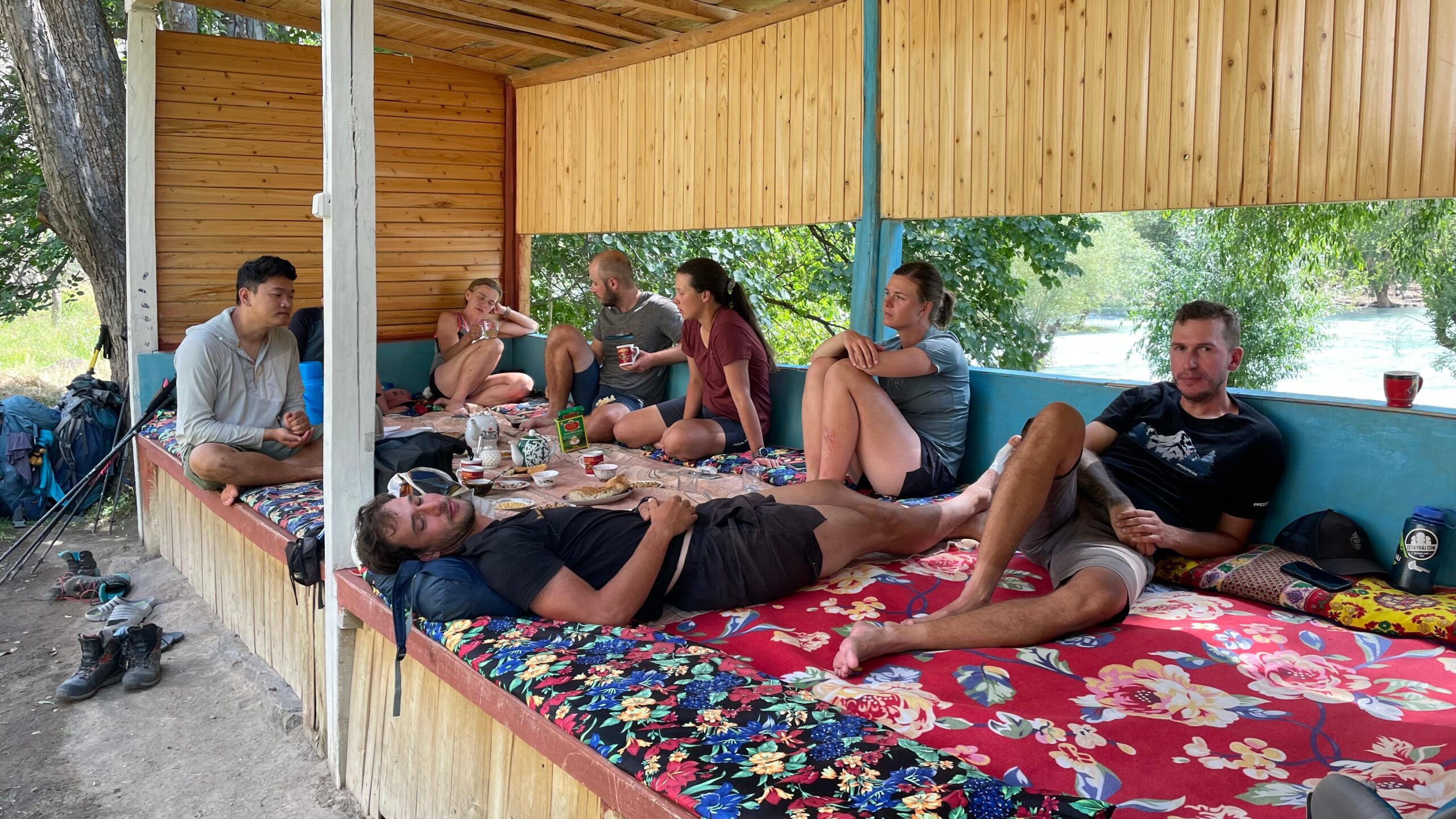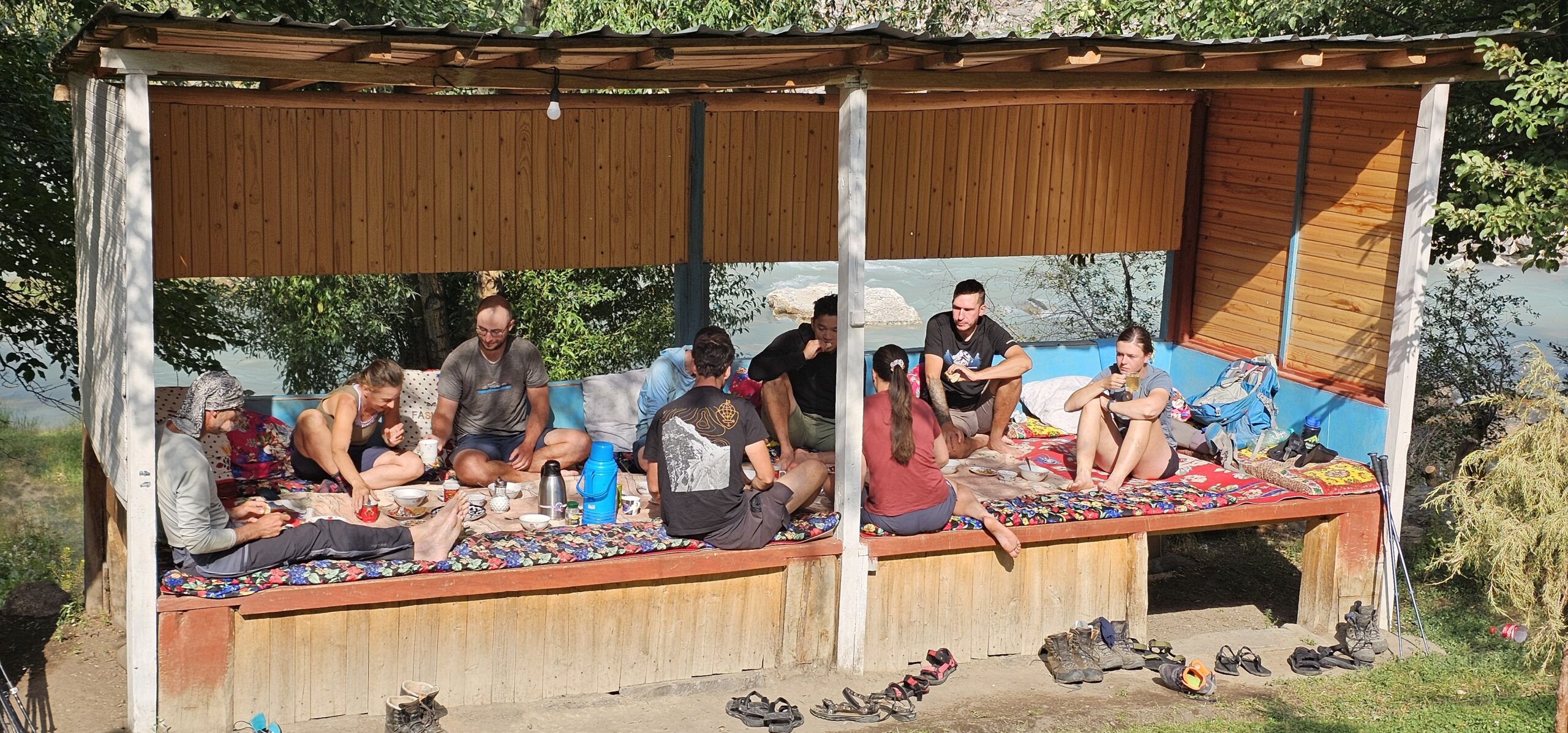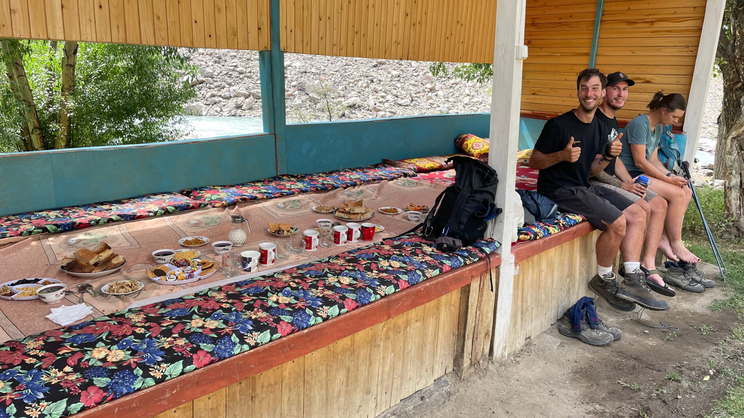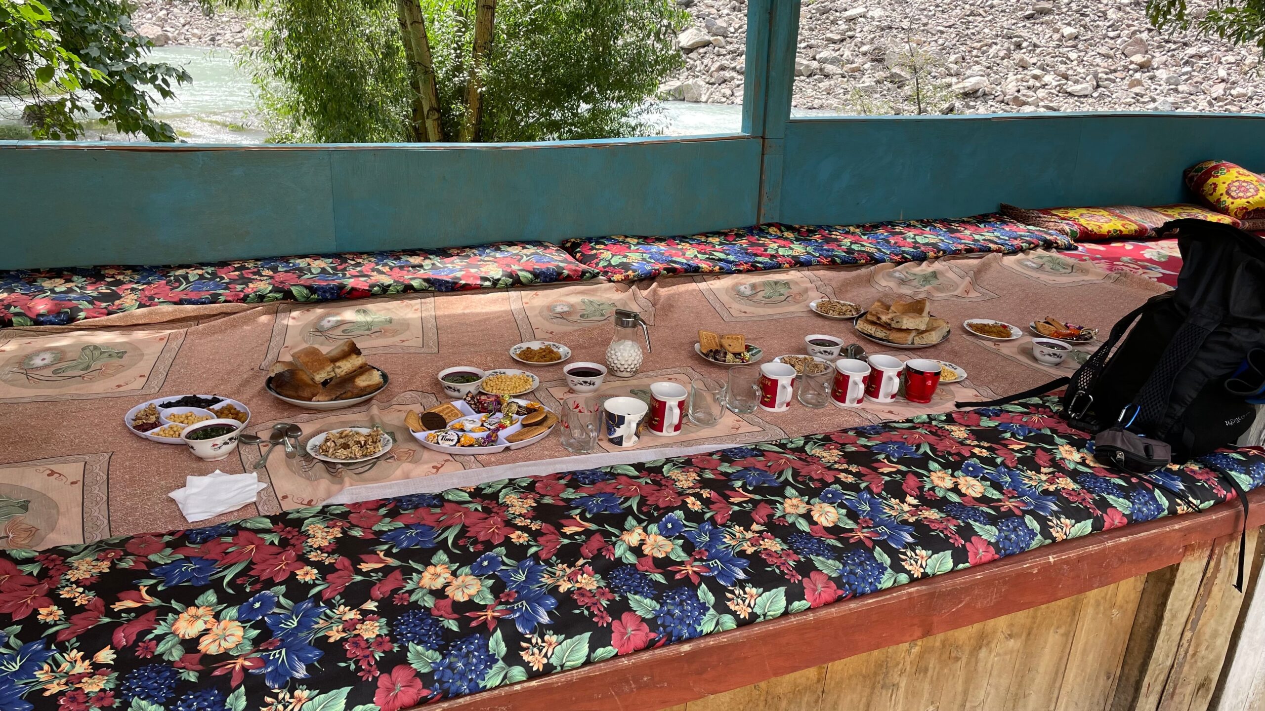Dojdeme do třetí vesnice, kde na nás čeká dřevěná konstrukce, která by se dala přirovnat k pergole, ale místo stolů a židlí tam je vyvýšená podesta, kde jsou koberce a polštáře a sedí a leží se tam. Ohlásíme se a za chvilku přijde mladá dáma, která se o nás bude následující dny starat, co se týká jídla a spaní. Mluví velmi dobře anglicky, takže nebude problém v komunikaci. Dozvíme se, že se jmenuje Naku, je učitelkou a nyní zde pomáhá svému strýci, tetě a prarodičům. A je okouzlující – obličeji vévodí nádherné tmavé oči a perské rysy. Ony dámy v Tádžikistánu jsou obecně krásné, jak jsme se, jak pánové, tak dámy, shodli. 😉 Za chvilku nám Naku přinese odpolední občerstvení v podobě jogurtu, zavařených třešní (ty byly naprosto luxusní), chlebu, různých druhů ořechů, sladkostí a čaje. Prostě luxus.