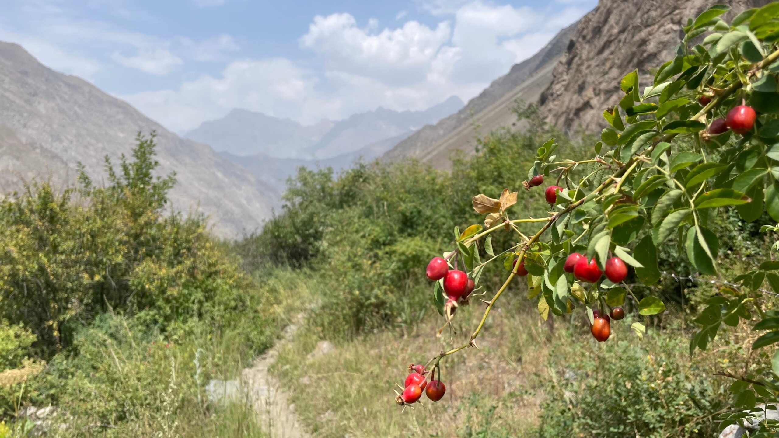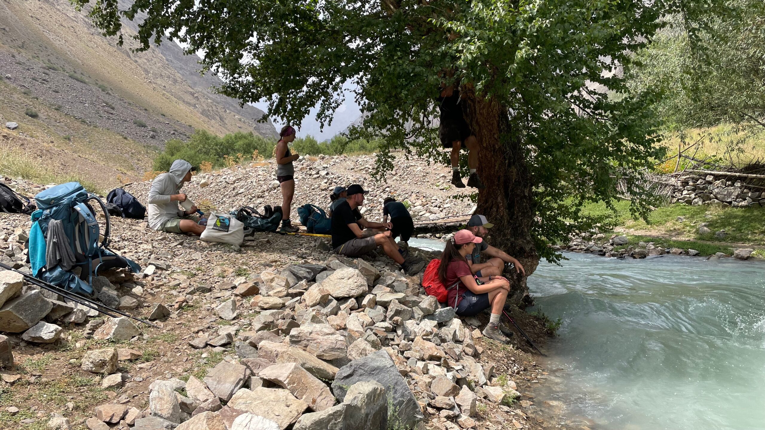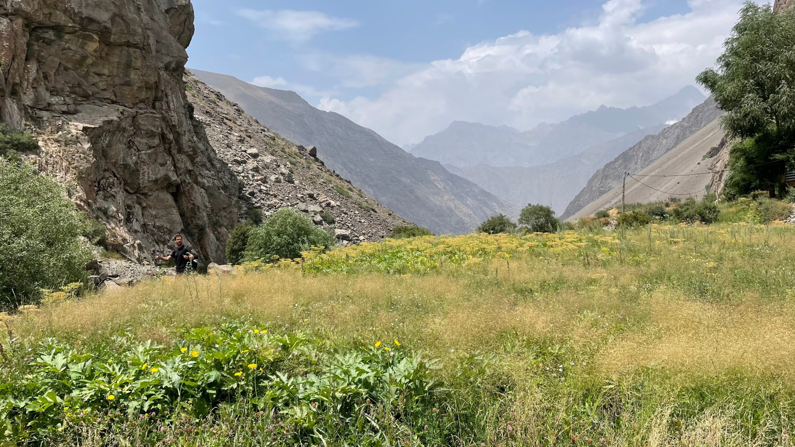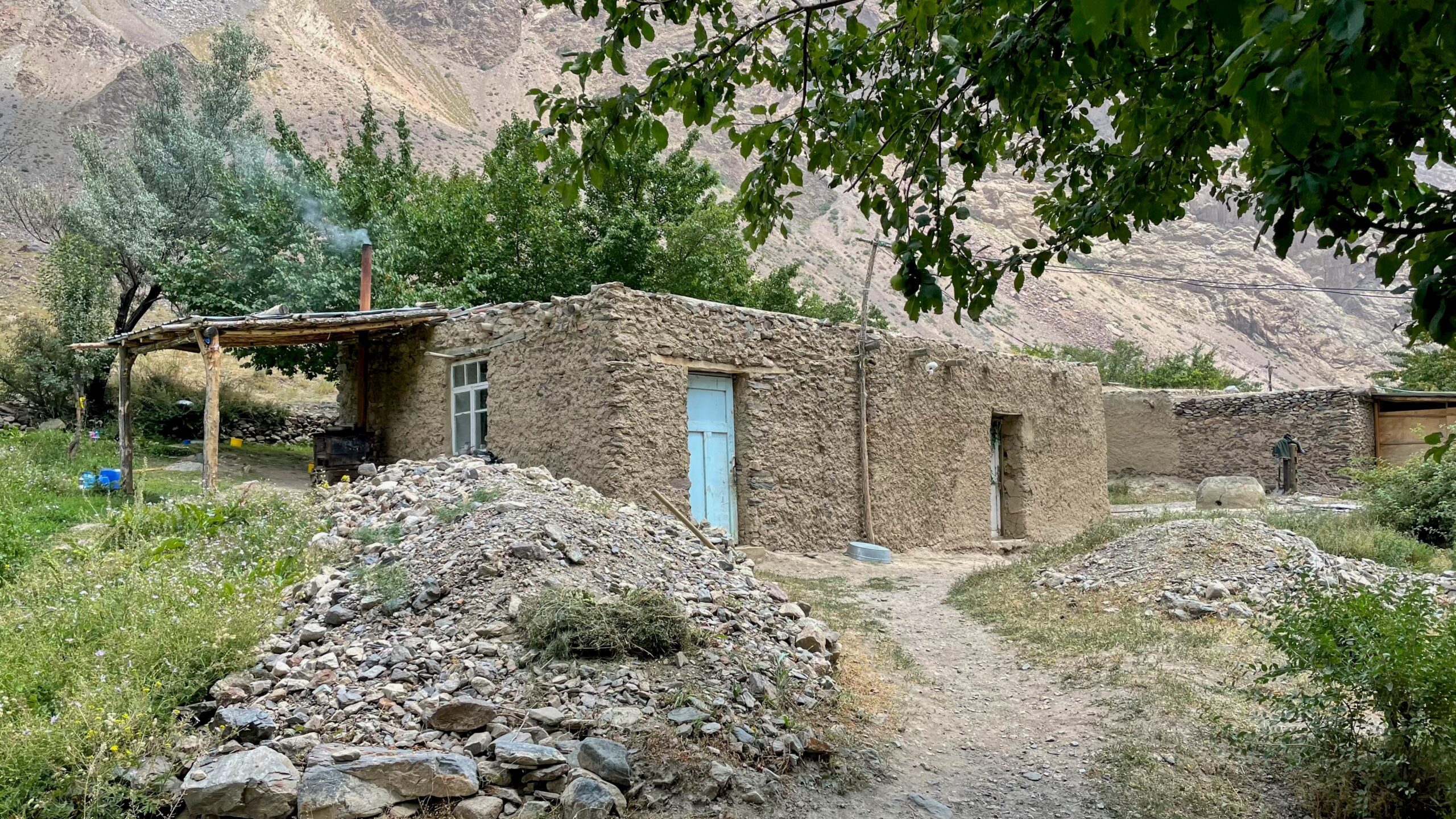 Dojdeme do třetí vesnice, kde na nás čeká dřevěná konstrukce, která by se dala přirovnat k pergole, ale místo stolů a židlí tam je vyvýšená podesta, kde jsou koberce a polštáře a sedí a leží se tam. Ohlásíme se a za chvilku přijde mladá dáma, která se o nás bude následující dny starat, co se týká jídla a spaní. Mluví velmi dobře anglicky, takže nebude problém v komunikaci. Dozvíme se, že se jmenuje Naku, je učitelkou a nyní zde pomáhá svému strýci, tetě a prarodičům. A je okouzlující – obličeji vévodí nádherné tmavé oči a perské rysy. Ony dámy v Tádžikistánu jsou obecně krásné, jak jsme se, jak pánové, tak dámy, shodli. 😉 Za chvilku nám Naku přinese odpolední občerstvení v podobě jogurtu, zavařených třešní (ty byly naprosto luxusní), chlebu, různých druhů ořechů, sladkostí a čaje. Prostě luxus.