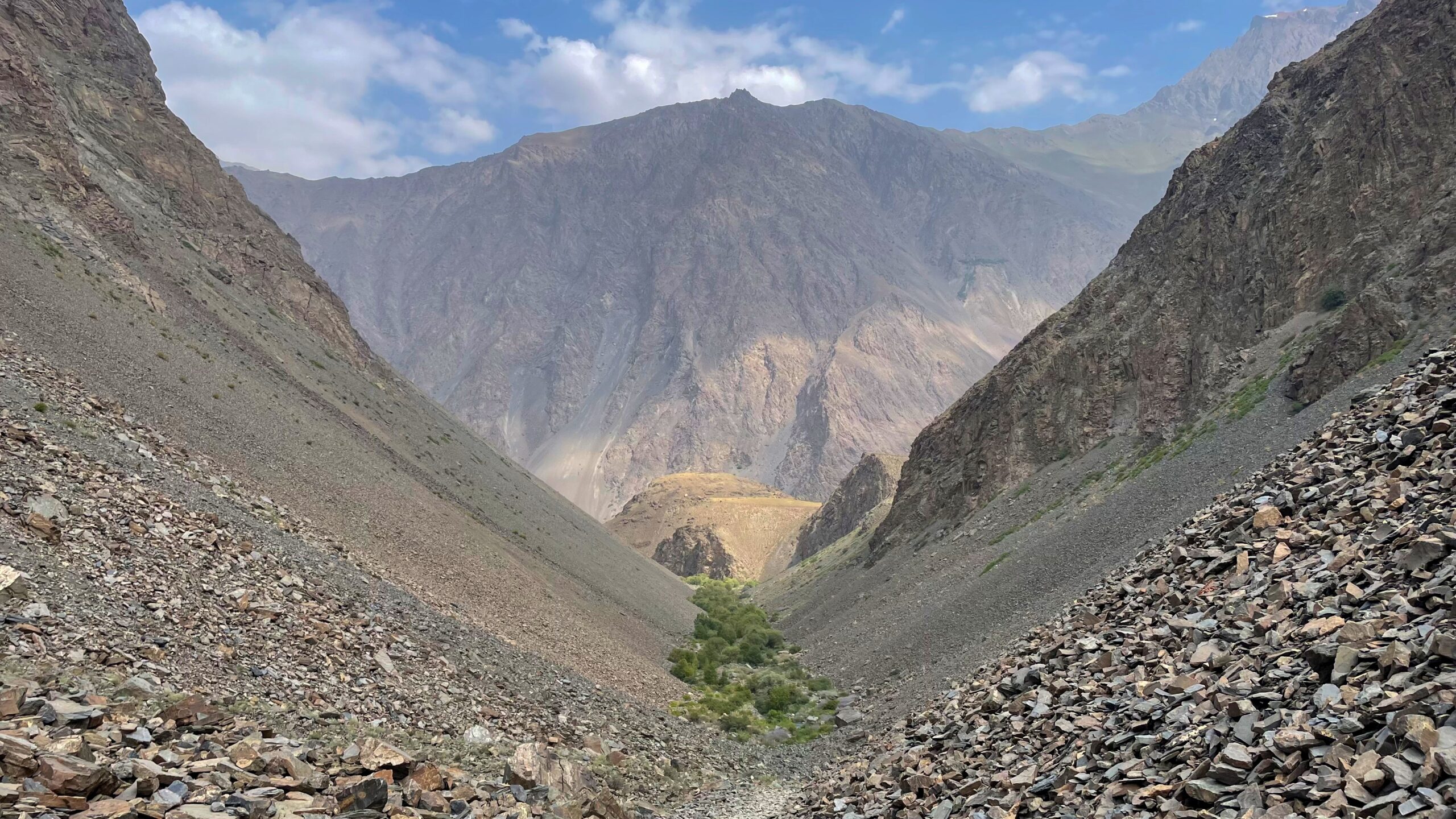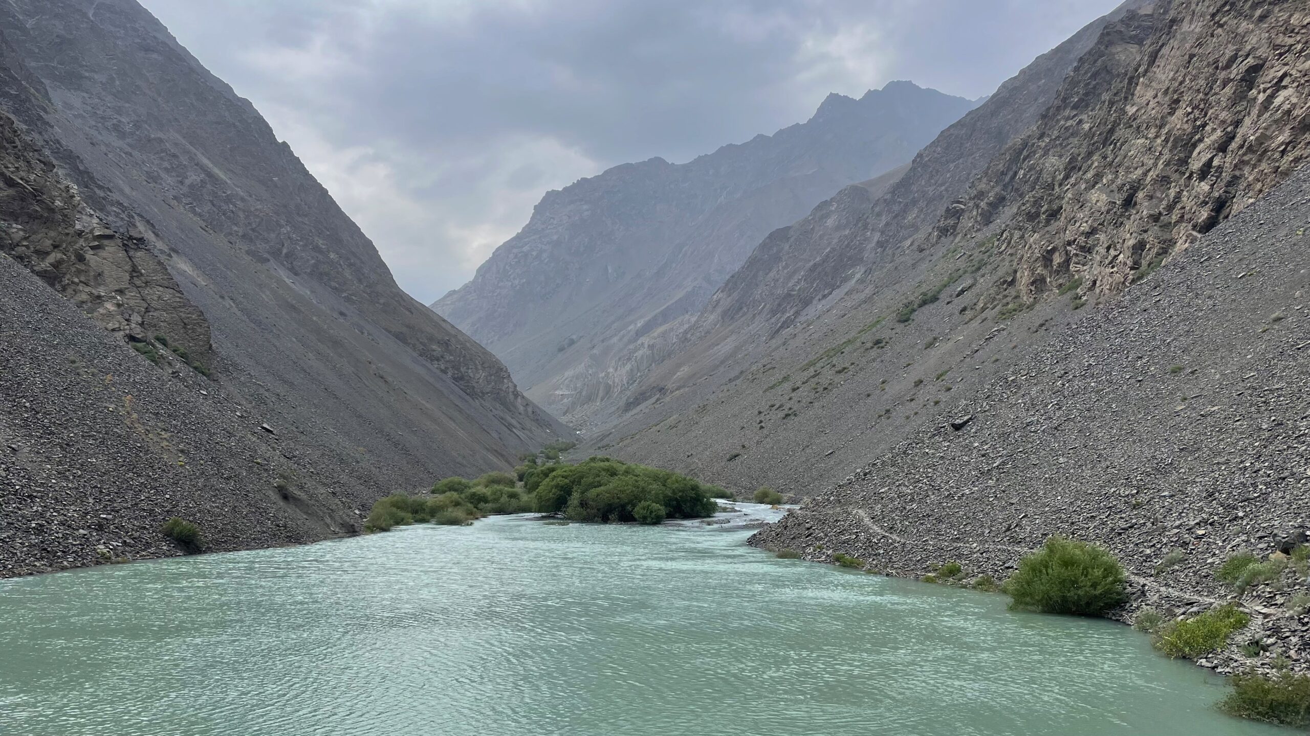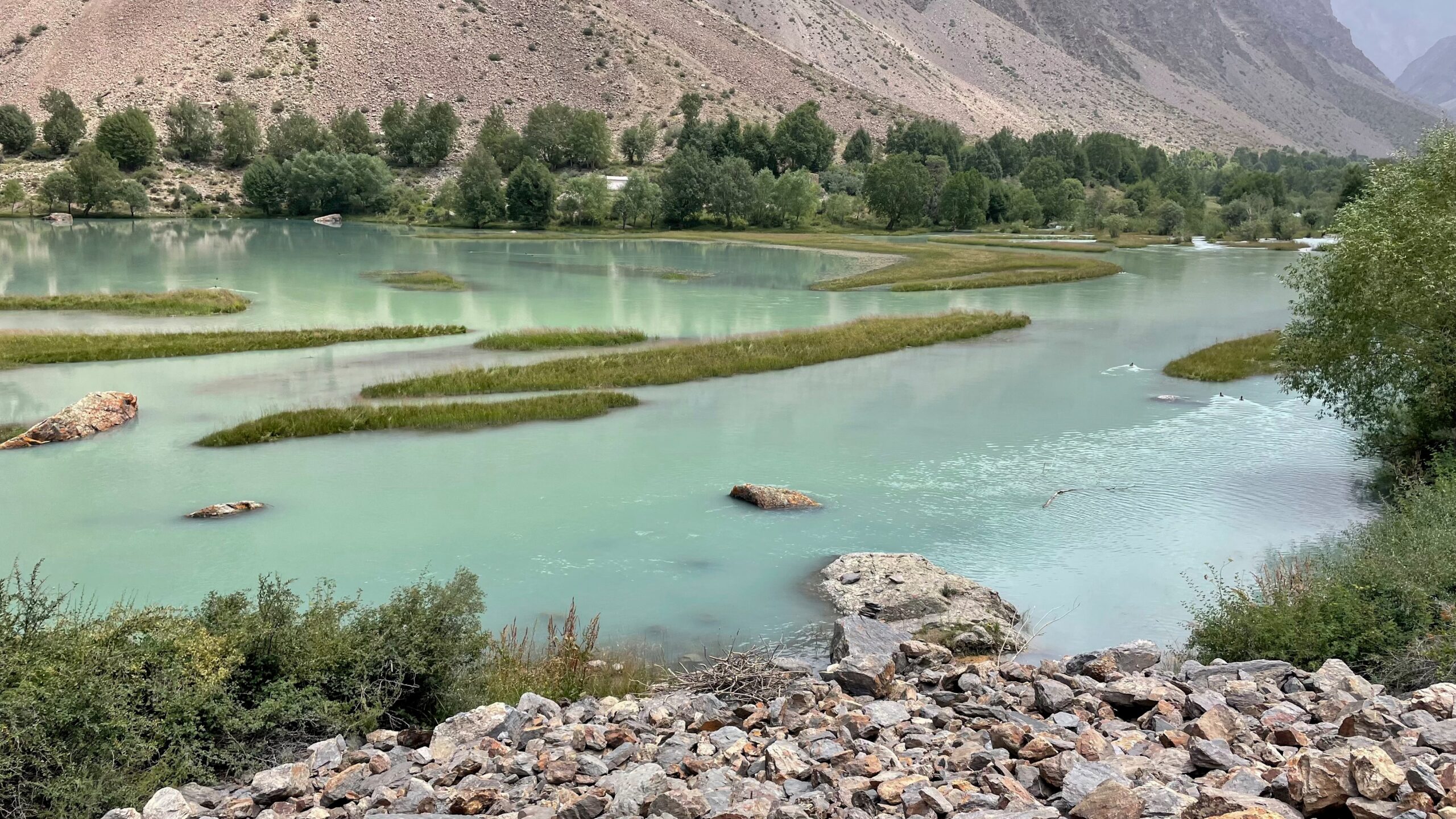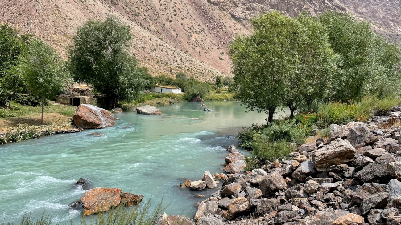 Dojdeme do třetí vesnice, kde na nás čeká dřevěná konstrukce, která by se dala přirovnat k pergole, ale místo stolů a židlí tam je vyvýšená podesta, kde jsou koberce a polštáře a sedí a leží se tam. Ohlásíme se a za chvilku přijde mladá dáma, která se o nás bude následující dny starat, co se týká jídla a spaní. Mluví velmi dobře anglicky, takže nebude problém v komunikaci. Dozvíme se, že se jmenuje Naku, je učitelkou a nyní zde pomáhá svému strýci, tetě a prarodičům. A je okouzlující – obličeji vévodí nádherné tmavé oči a perské rysy. Ony dámy v Tádžikistánu jsou obecně krásné, jak jsme se, jak pánové, tak dámy, shodli. 😉 Za chvilku nám Naku přinese odpolední občerstvení v podobě jogurtu, zavařených třešní (ty byly naprosto luxusní), chlebu, různých druhů ořechů, sladkostí a čaje. Prostě luxus.