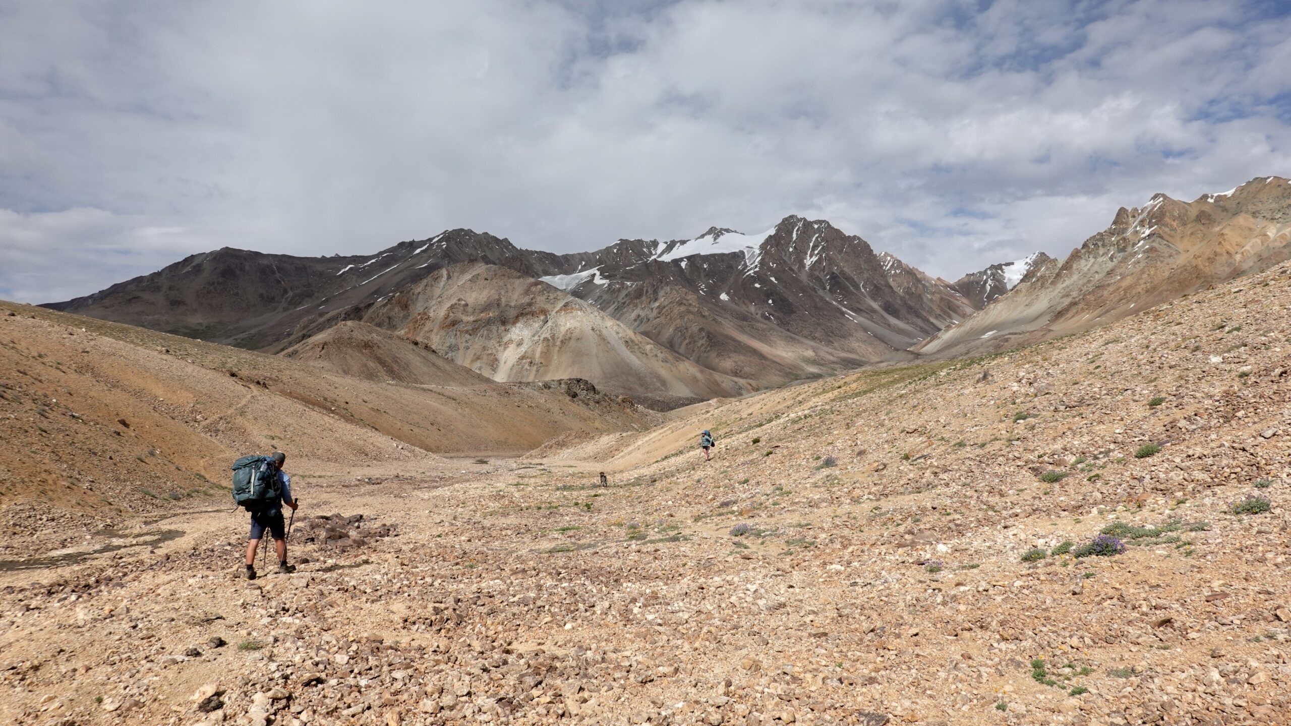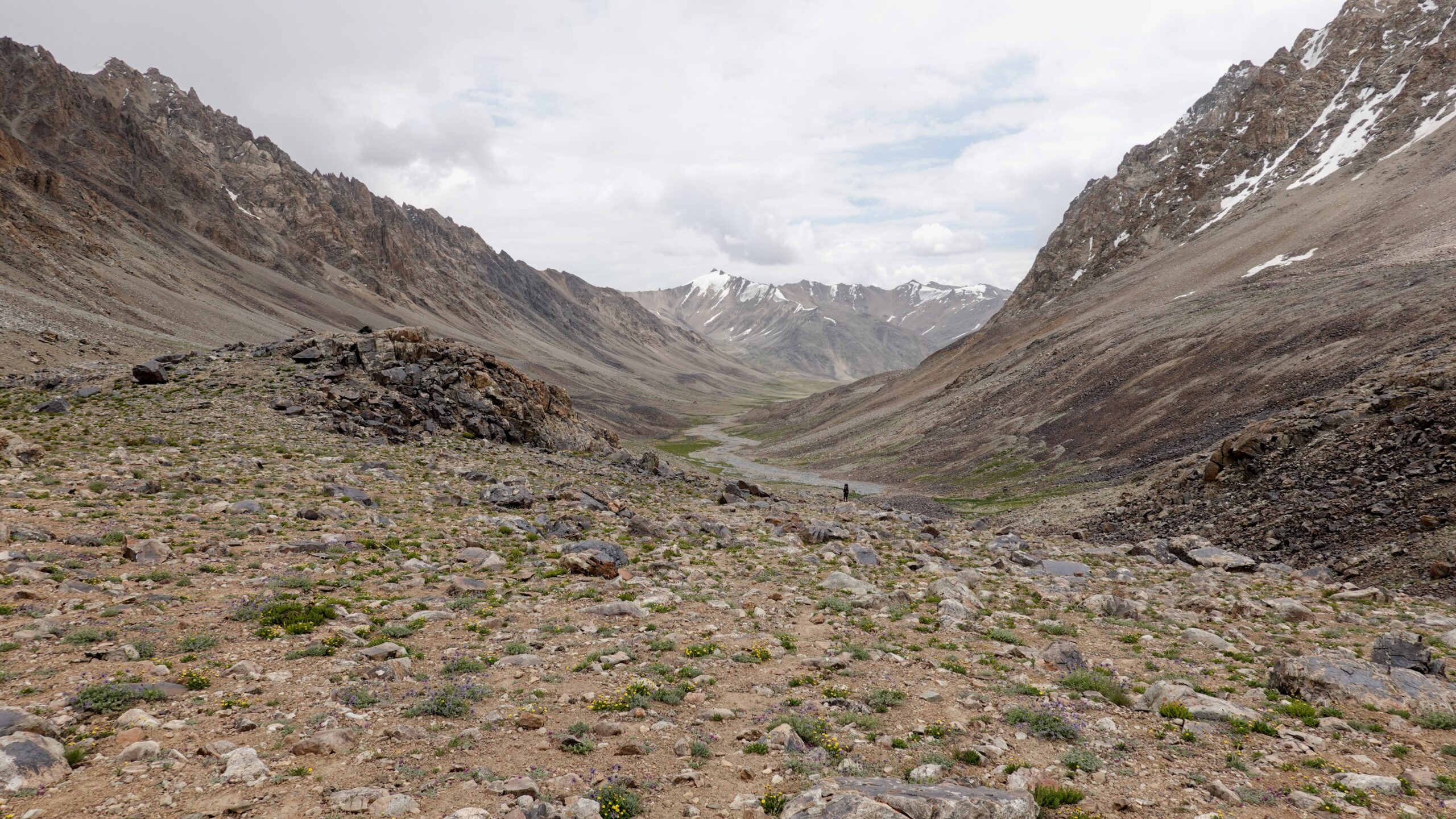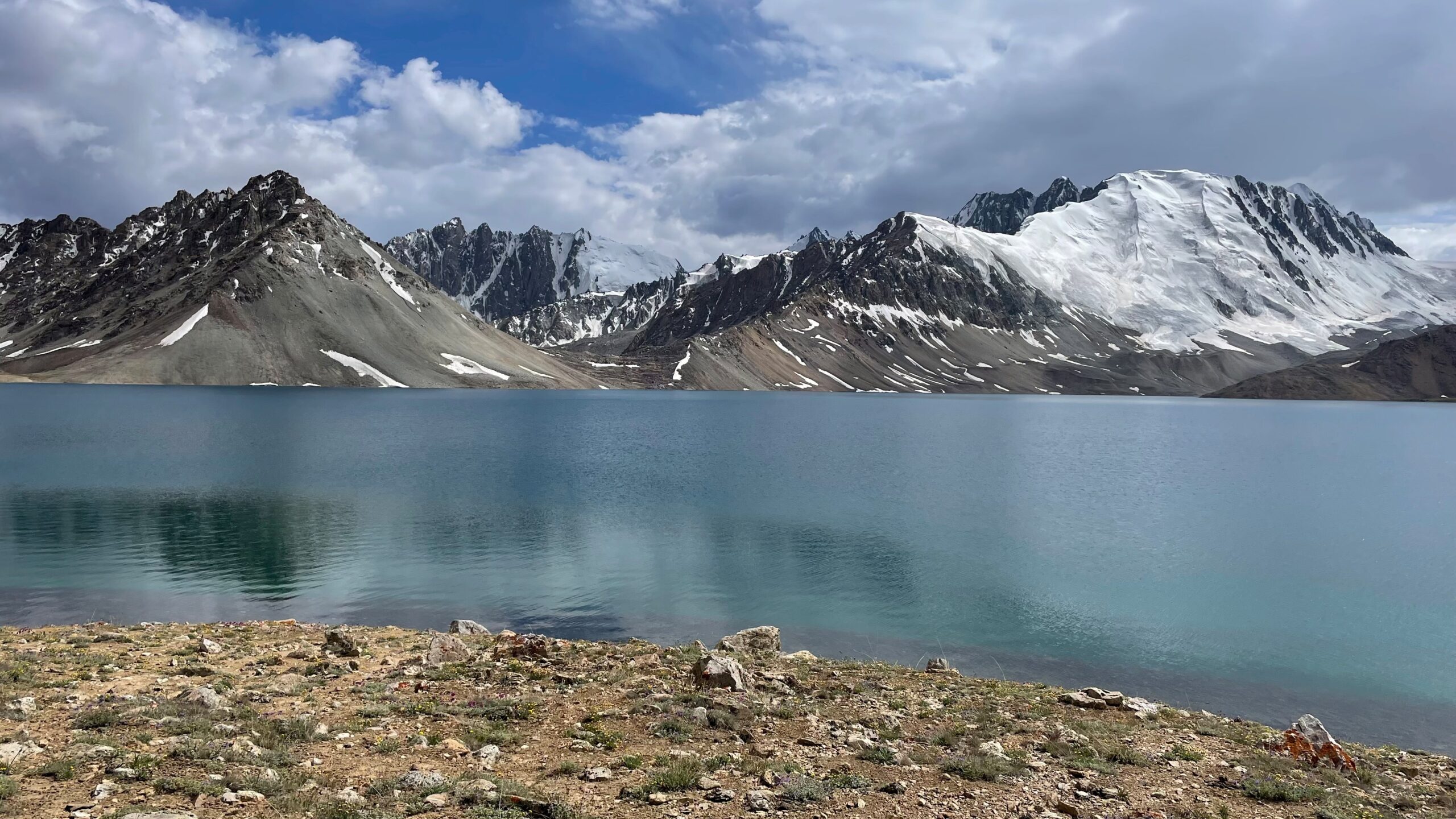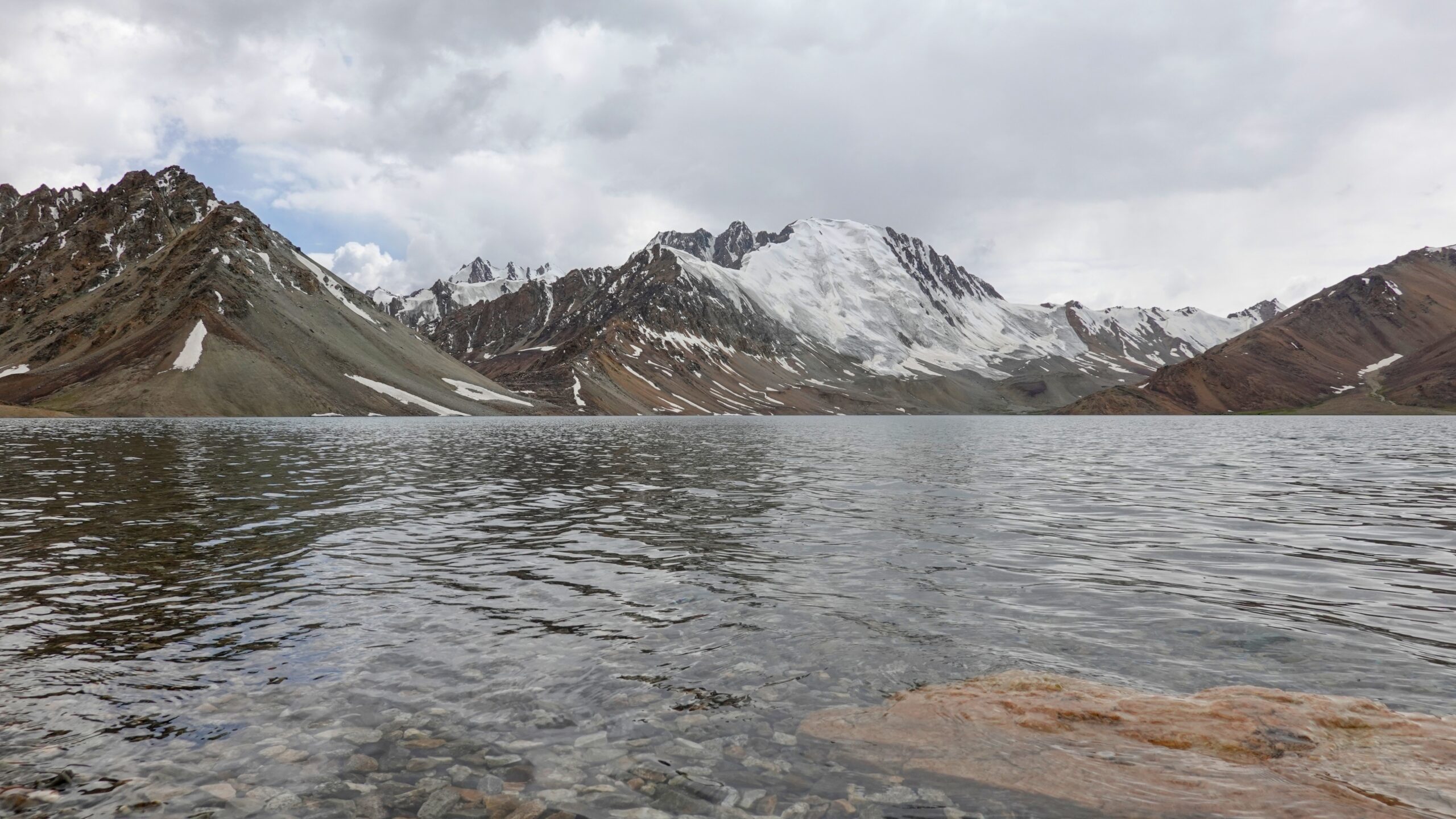Následující pasáž nás vede kolem jezera Chapdarkul. Toto jezero je za dobrých světelných podmínek naprosto bezprecedentní, ale zatím s námi počasí a hlavně Slunce nespolupracuje. Prokousáváme se celkem složitým kamenným terénem, takže, i když jsme na rovině, tak jdeme celkem pomalu. Narazíme i na zbytky sněhu, takže neodolám a musím si šlápnout a dotknout se té bílé hmoty. 😉 Protože dvojitá porce batohů je opravdu mega zátěž, tak po několika km Kubovi trochu odlehčíme, kdy něco vezme Blanka a něco já. Už tady si všímám, že Blanka je taková tichá voda, která břehy mele. Každým dnem si nabírá stále víc a víc věcí a pořád je v pohodě. Je snad stroj??? 😀 Když zahlašujeme pauzu u jezera, tak se vyčasí a jezero se začne krásně zabarvovat. Tak se nám to líbí. Sice lehce fouká, takže nemáme „zrcadlo“, ale i tak to je luxusní podívaná.