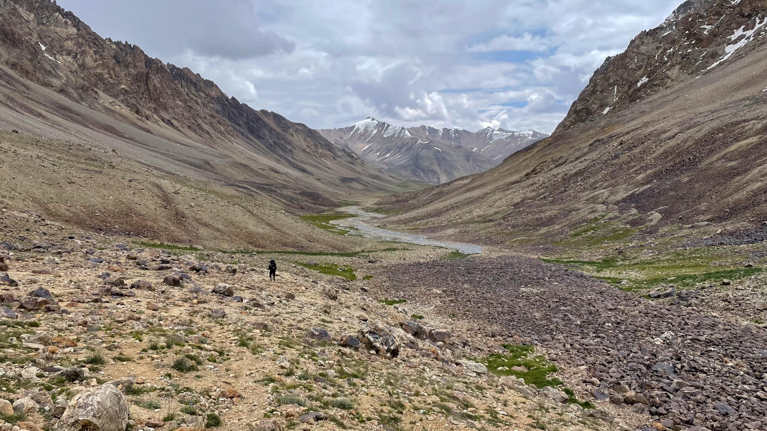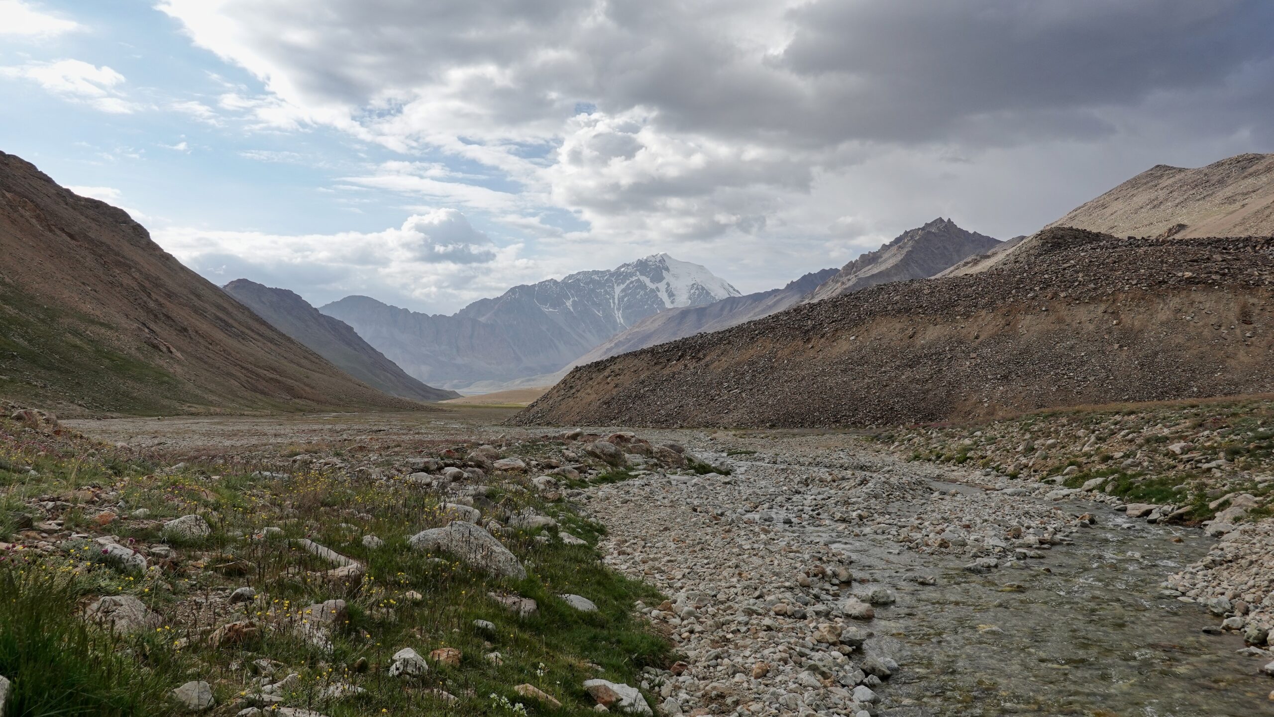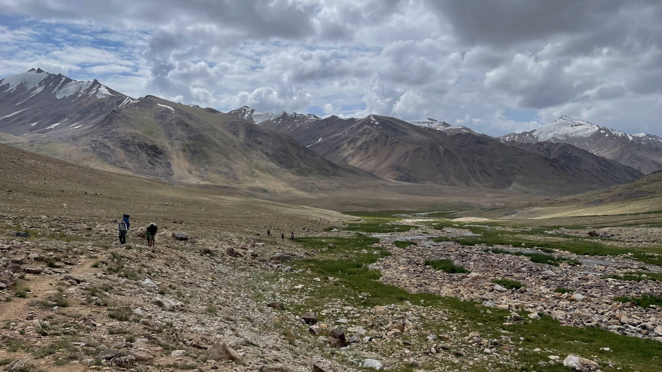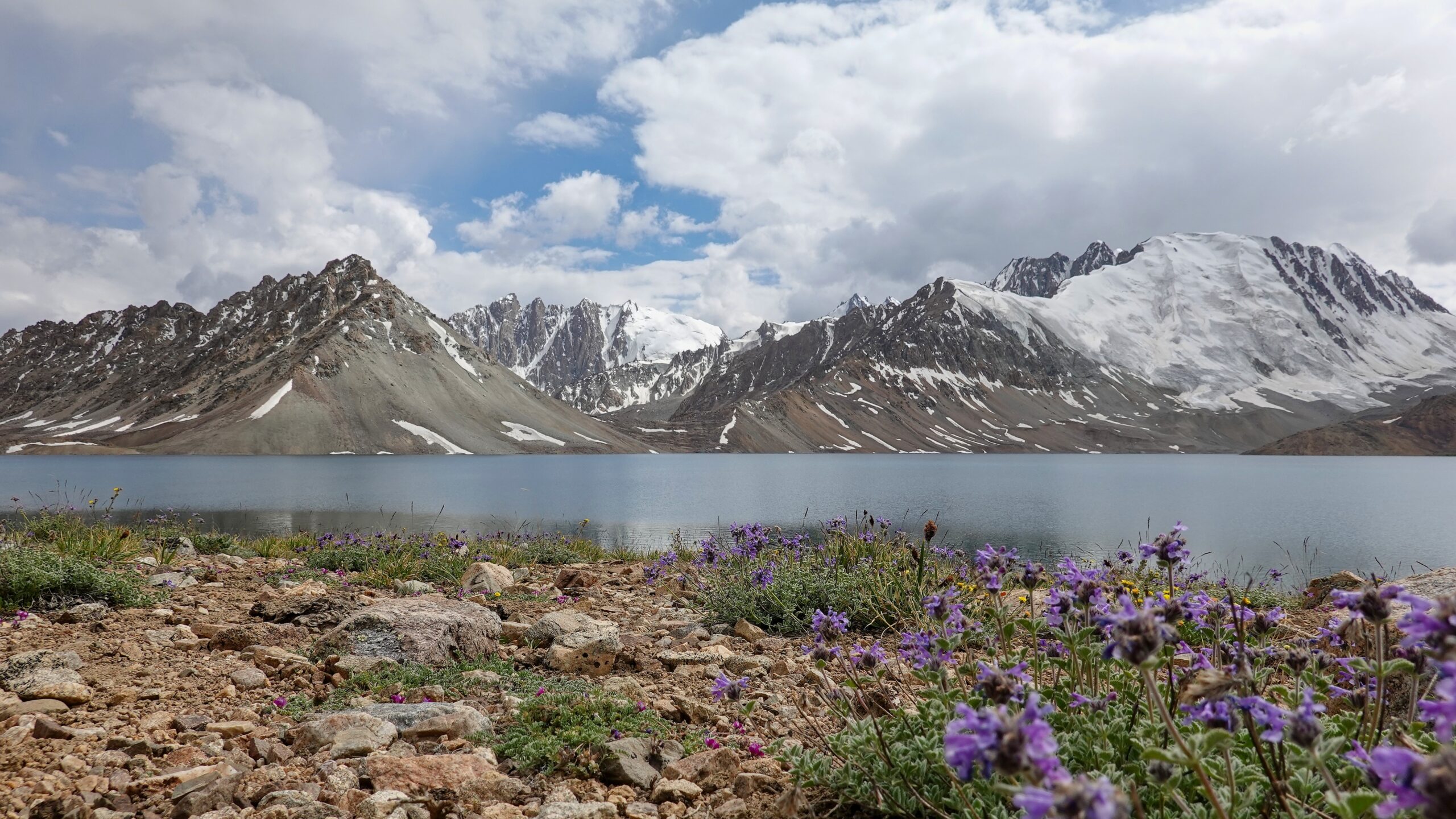 Následující pasáž nás vede kolem jezera Chapdarkul. Toto jezero je za dobrých světelných podmínek naprosto bezprecedentní, ale zatím s námi počasí a hlavně Slunce nespolupracuje. Prokousáváme se celkem složitým kamenným terénem, takže, i když jsme na rovině, tak jdeme celkem pomalu. Narazíme i na zbytky sněhu, takže neodolám a musím si šlápnout a dotknout se té bílé hmoty. 😉 Protože dvojitá porce batohů je opravdu mega zátěž, tak po několika km Kubovi trochu odlehčíme, kdy něco vezme Blanka a něco já. Už tady si všímám, že Blanka je taková tichá voda, která břehy mele. Každým dnem si nabírá stále víc a víc věcí a pořád je v pohodě. Je snad stroj??? 😀 Když zahlašujeme pauzu u jezera, tak se vyčasí a jezero se začne krásně zabarvovat. Tak se nám to líbí. Sice lehce fouká, takže nemáme „zrcadlo“, ale i tak to je luxusní podívaná.