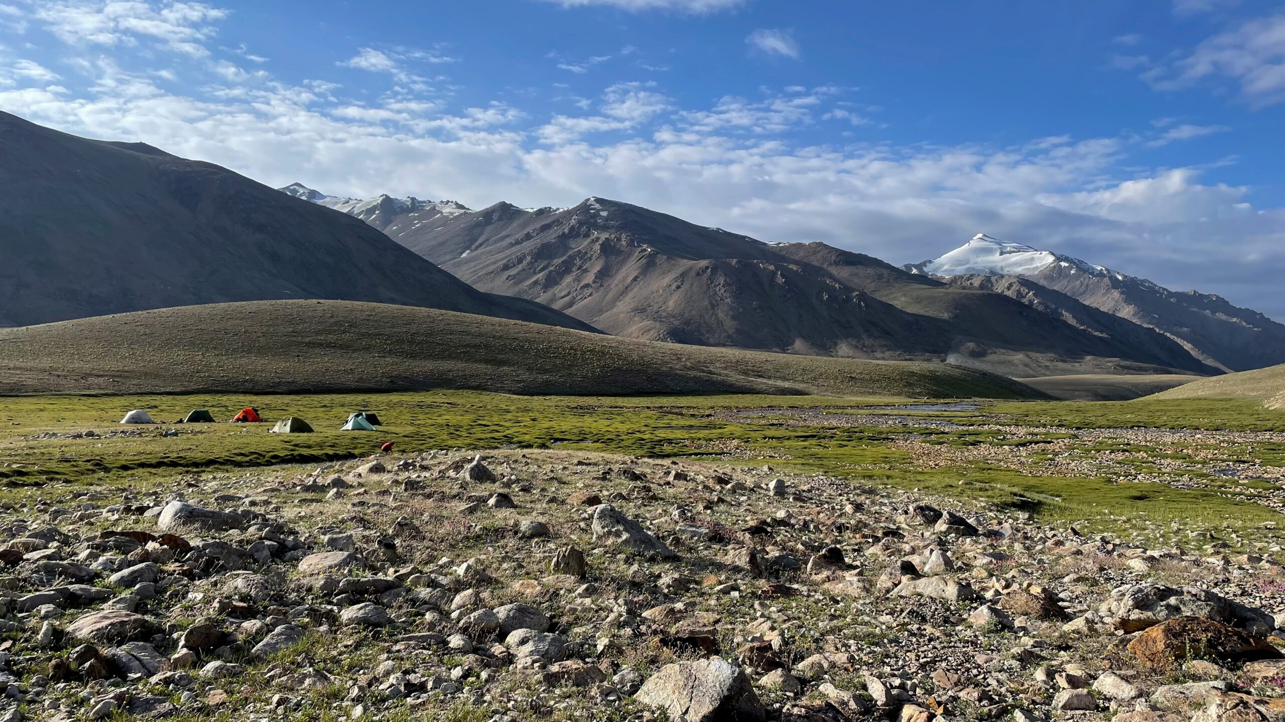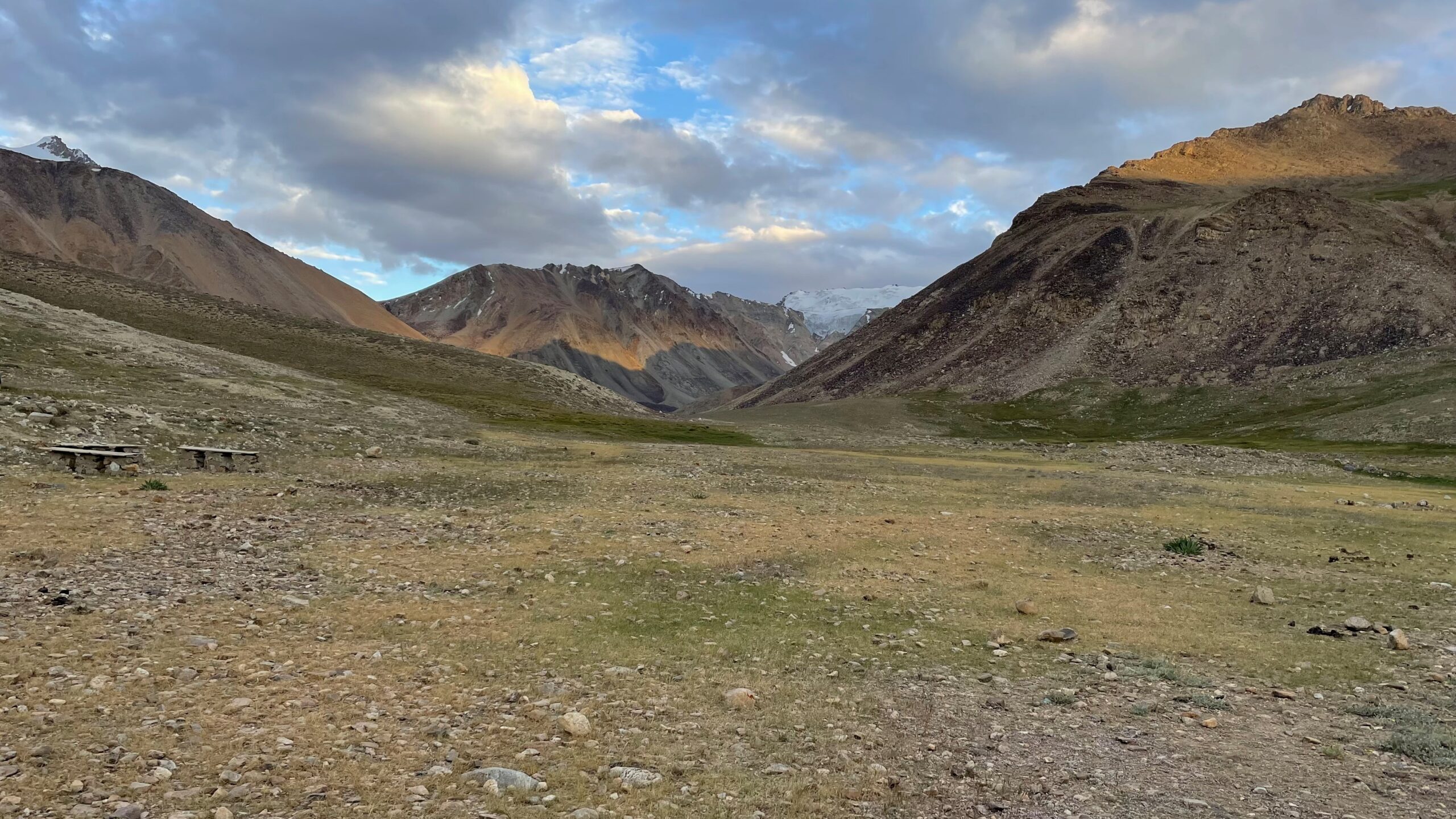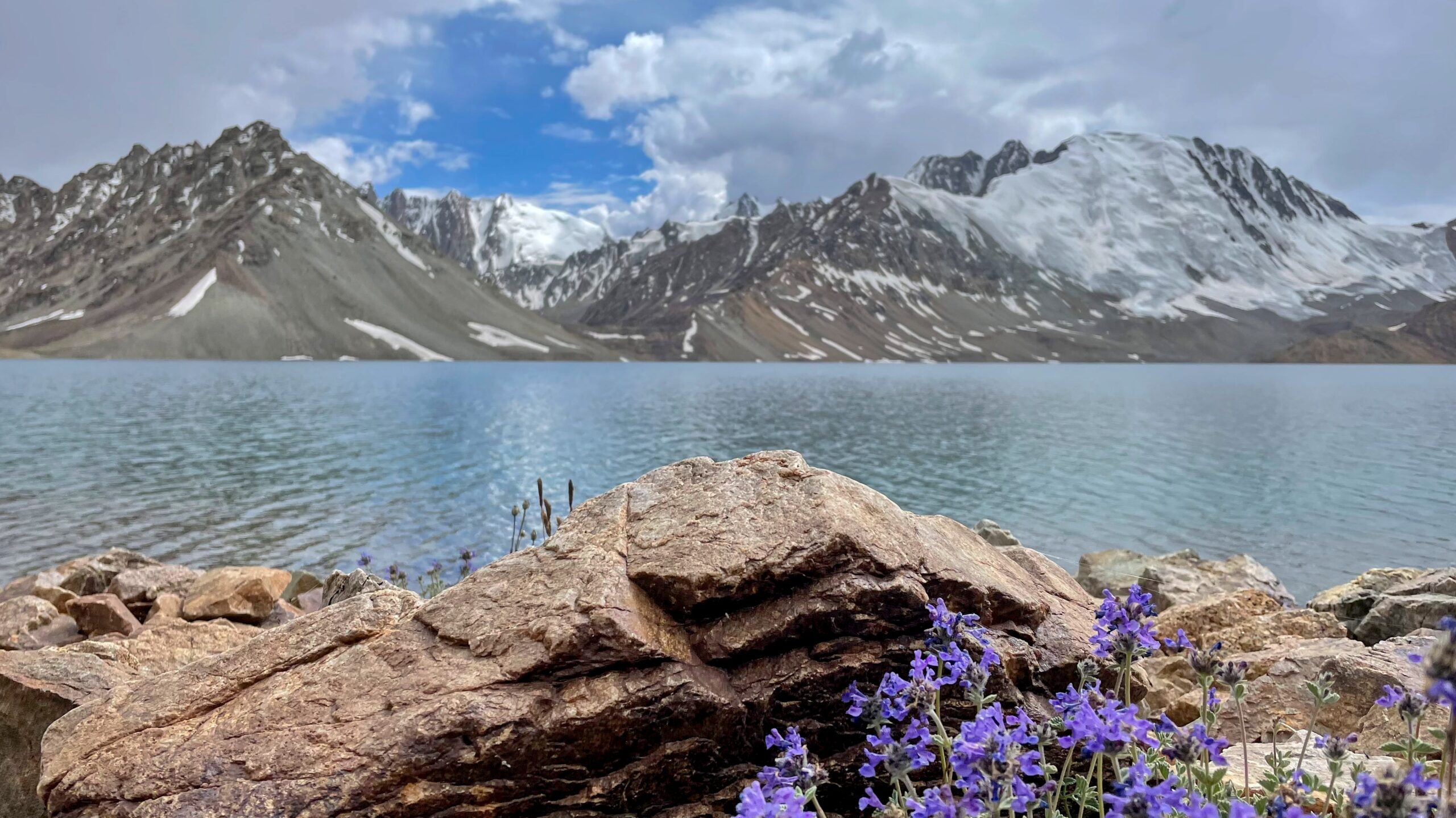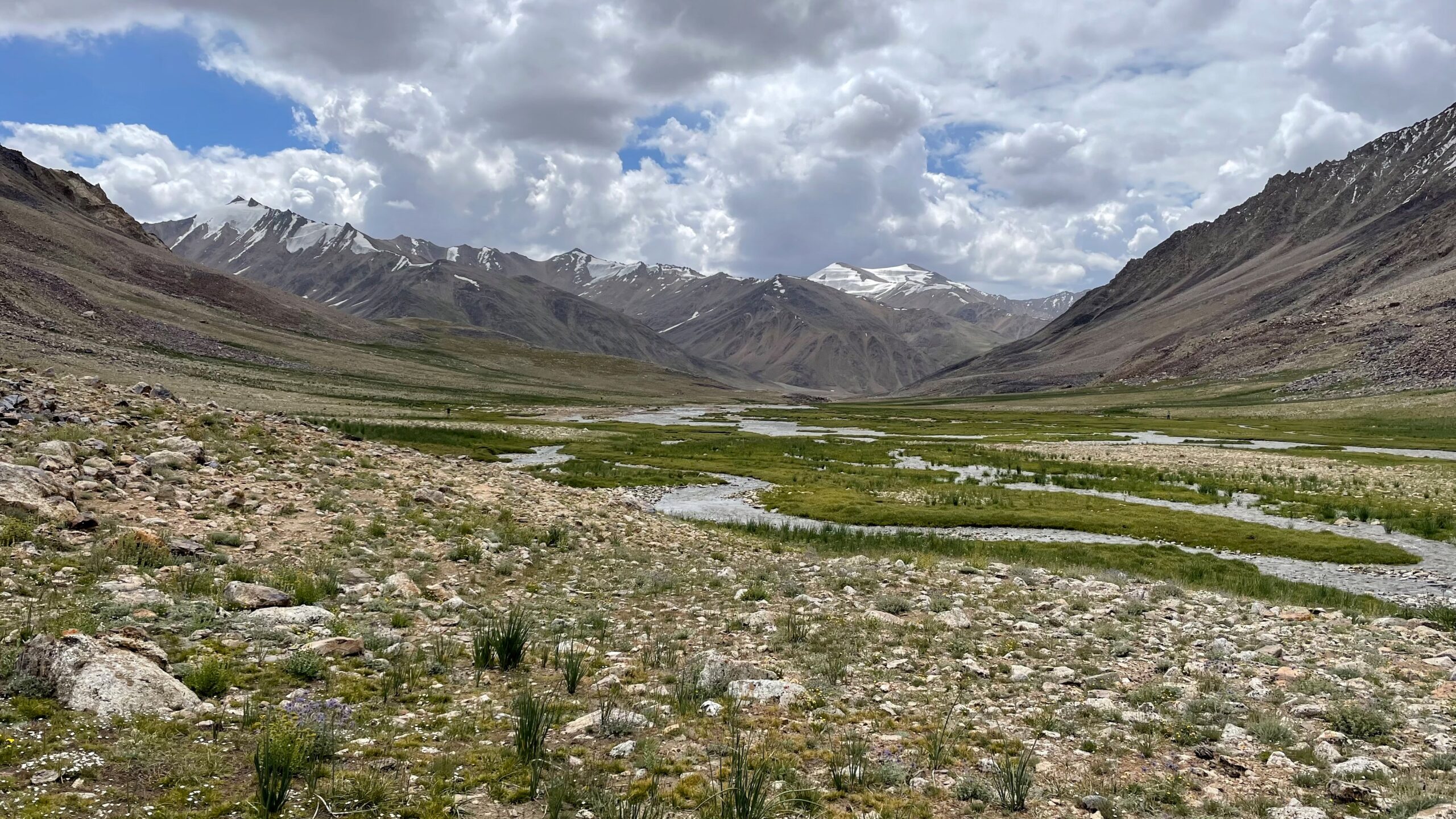 Následující pasáž nás vede kolem jezera Chapdarkul. Toto jezero je za dobrých světelných podmínek naprosto bezprecedentní, ale zatím s námi počasí a hlavně Slunce nespolupracuje. Prokousáváme se celkem složitým kamenným terénem, takže, i když jsme na rovině, tak jdeme celkem pomalu. Narazíme i na zbytky sněhu, takže neodolám a musím si šlápnout a dotknout se té bílé hmoty. 😉 Protože dvojitá porce batohů je opravdu mega zátěž, tak po několika km Kubovi trochu odlehčíme, kdy něco vezme Blanka a něco já. Už tady si všímám, že Blanka je taková tichá voda, která břehy mele. Každým dnem si nabírá stále víc a víc věcí a pořád je v pohodě. Je snad stroj??? 😀 Když zahlašujeme pauzu u jezera, tak se vyčasí a jezero se začne krásně zabarvovat. Tak se nám to líbí. Sice lehce fouká, takže nemáme „zrcadlo“, ale i tak to je luxusní podívaná.