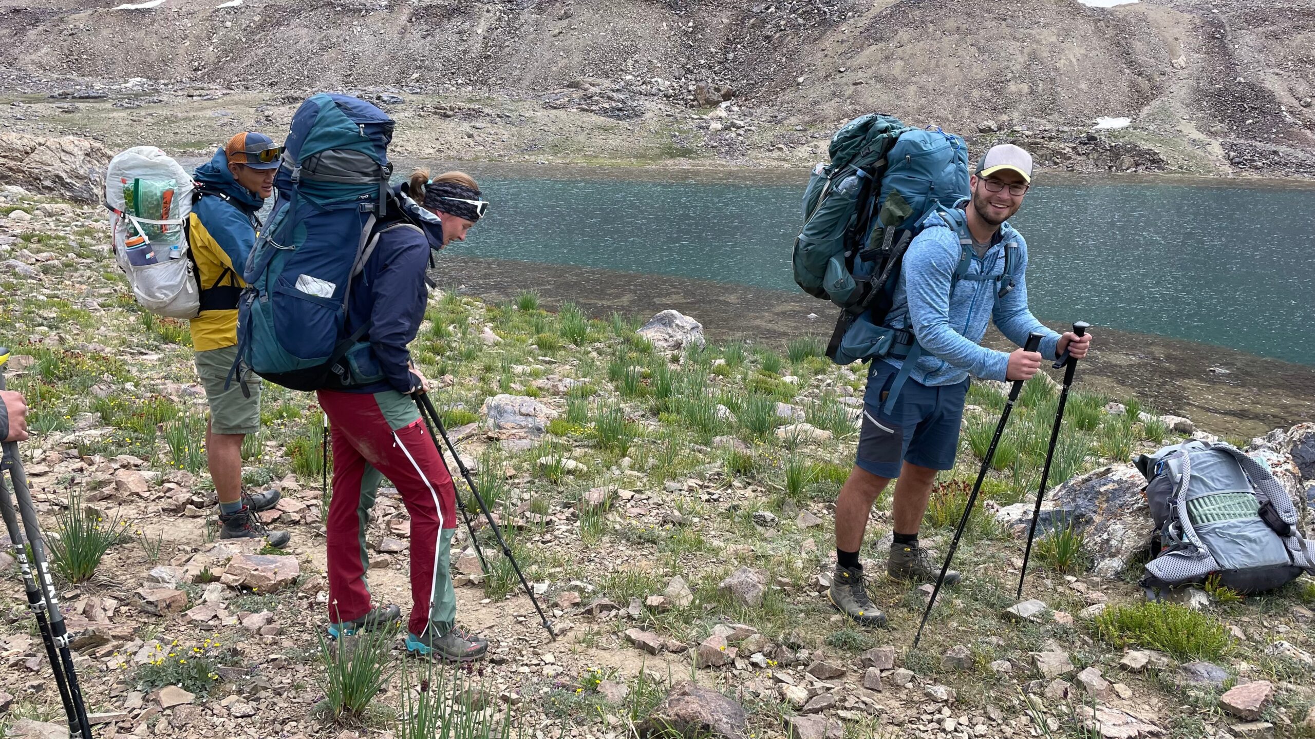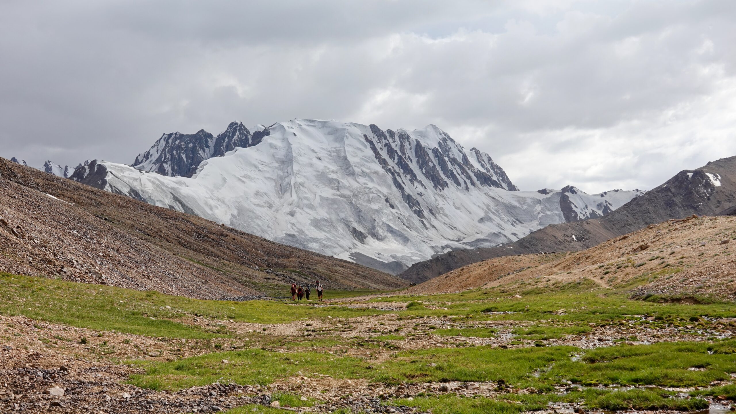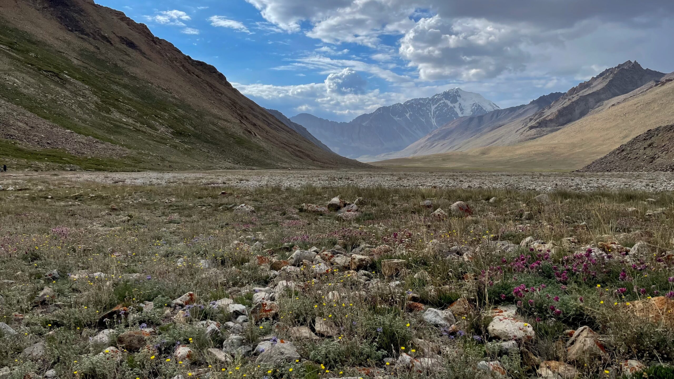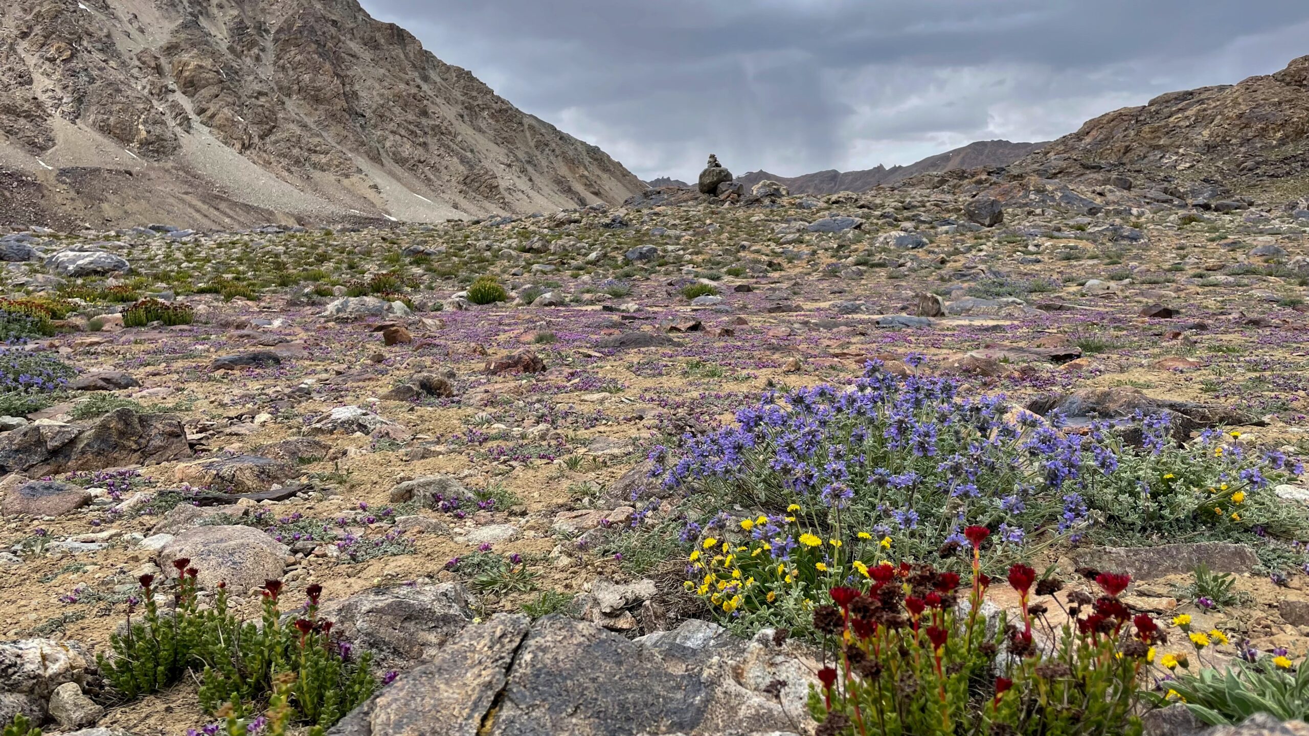 Následující pasáž nás vede kolem jezera Chapdarkul. Toto jezero je za dobrých světelných podmínek naprosto bezprecedentní, ale zatím s námi počasí a hlavně Slunce nespolupracuje. Prokousáváme se celkem složitým kamenným terénem, takže, i když jsme na rovině, tak jdeme celkem pomalu. Narazíme i na zbytky sněhu, takže neodolám a musím si šlápnout a dotknout se té bílé hmoty. 😉 Protože dvojitá porce batohů je opravdu mega zátěž, tak po několika km Kubovi trochu odlehčíme, kdy něco vezme Blanka a něco já. Už tady si všímám, že Blanka je taková tichá voda, která břehy mele. Každým dnem si nabírá stále víc a víc věcí a pořád je v pohodě. Je snad stroj??? 😀 Když zahlašujeme pauzu u jezera, tak se vyčasí a jezero se začne krásně zabarvovat. Tak se nám to líbí. Sice lehce fouká, takže nemáme „zrcadlo“, ale i tak to je luxusní podívaná.