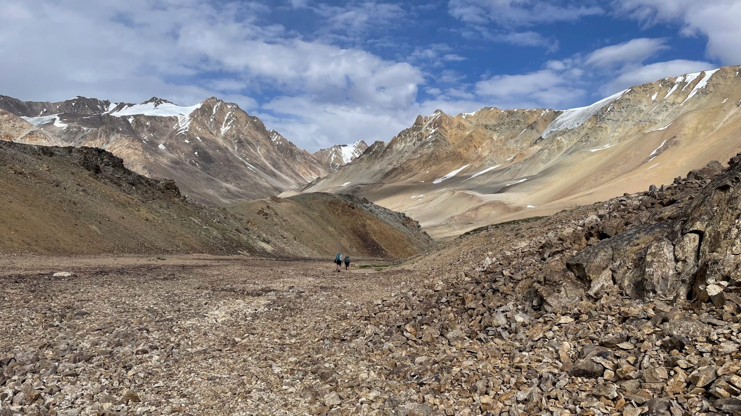 Během pauzy Jirka něco řekne směrem k dámám, a pak se mě ze srandy ptá, jestli to dobře pochopil, že jejich odpověď byla NE. Já se toho opět chytnu a reaguji: „Ano, Jirko. Tohle bylo NE. Děláš mi radost, co se týká čtení mezi řádky. Ještě tak dva, tři dny a pustím tě samotného do světa.“ 😀 Poté, co jsme všichni uhasili žízeň po fotkách ze všech úhlů, pokračujeme obrovským kamenným řečištěm dolů. Je to další neskutečný pohled, který se mi natrvalo zacementoval do paměti. Všude, kam oko dohlédne, je pouze kamení od mini kamínků až po pořádné šutráky, nulová vegetace a odpolední sluneční paprsky vše zabarvují do teplých okrových barev. Jen vrcholky okolních hor jsou pokryty sněhem. A v tom obrovském kamenném korytě jdeme my coby mini postavičky. Sestup dolů je ale nekonečný a už se těšíme na kemp. Během cesty probíráme, jak to funguje v našem lékařství, protože se máme koho ptát – jak jsem psal, v týmu máme 2 doktorky a 1 doktora. 😉