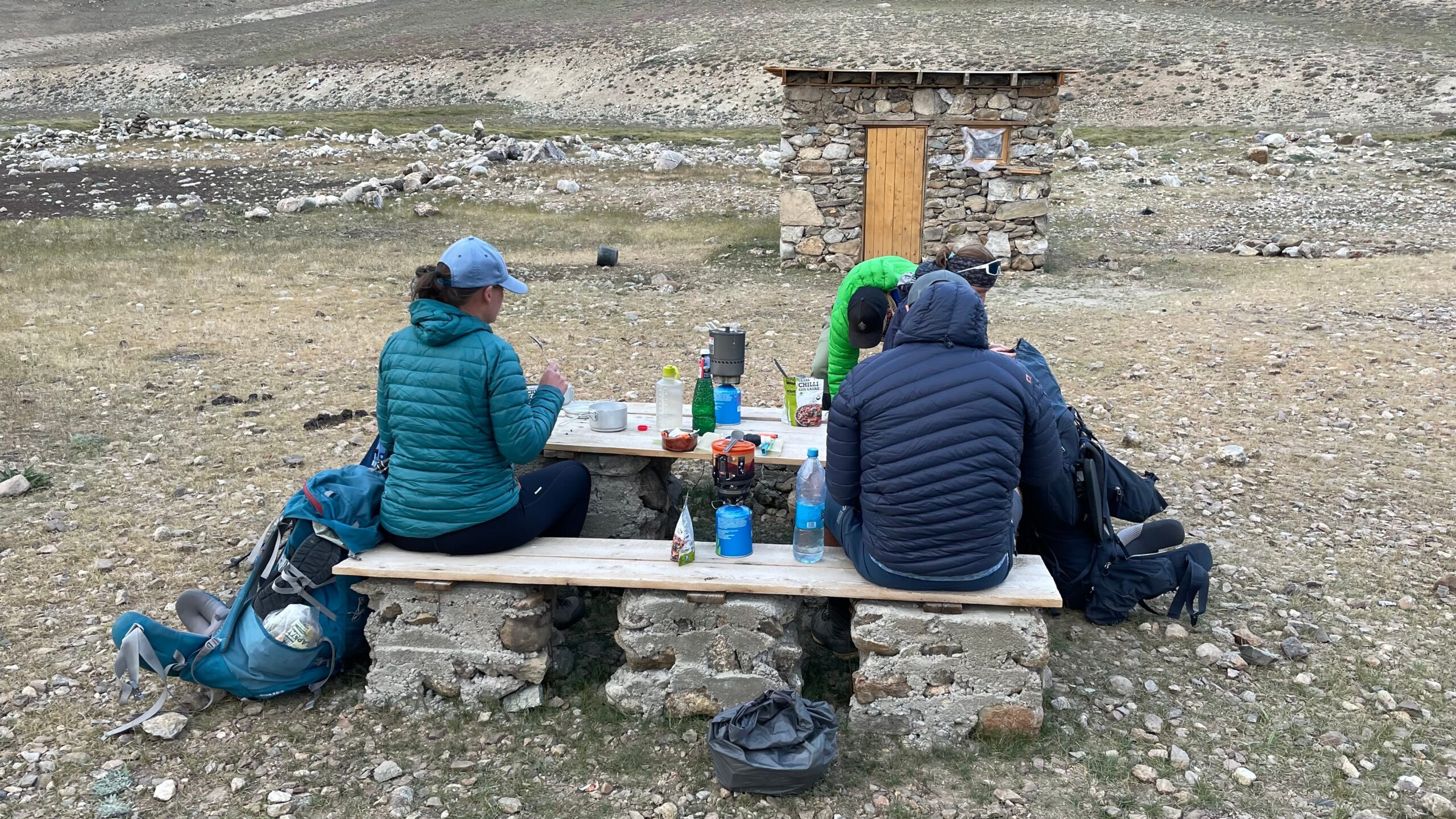 Jakmile sejdeme na pomyslné dno kamenného údolí, tak se prokousáváme místy hypnotickou krajinou a tlačíme km, co to dá. Únava nám začíná klepat na ramena, protože díky tomu jak máme od ostatních nějaké věci, tak se batohy pronesou. A co teprve Kuba, který má double, co se týká batohů. Dokonce i Blanka, kterou, jak jsem psal, podezřívám, zda není stroj, uznává, že dneska to bylo náročné. 😉 Kuba opět zahlašuje zbývající vzdálenost – 2,4 km, pak 1,7 km. Neutíká to, ale my to doklepneme. 880 metrů!!! Uff a jsme doma. 😉 Tábořiště máme na místě, kde je kamenná bouda a poblíž je stůl s lavicemi. To znamená jediné – dneska budeme u večeře sedět. 😉 Vybalujeme věci a Blanka trefně poznamená, že bude burza, kde si každý přebere, co je jeho, protože již netušíme, kdo co má od koho. Naše první skupinka rychle postaví stany a vaří večeři. Plán je, abychom byli hotovi než dorazí zbytek, kdy jim pak pomůžeme s filtrováním vody, vařením, atd.